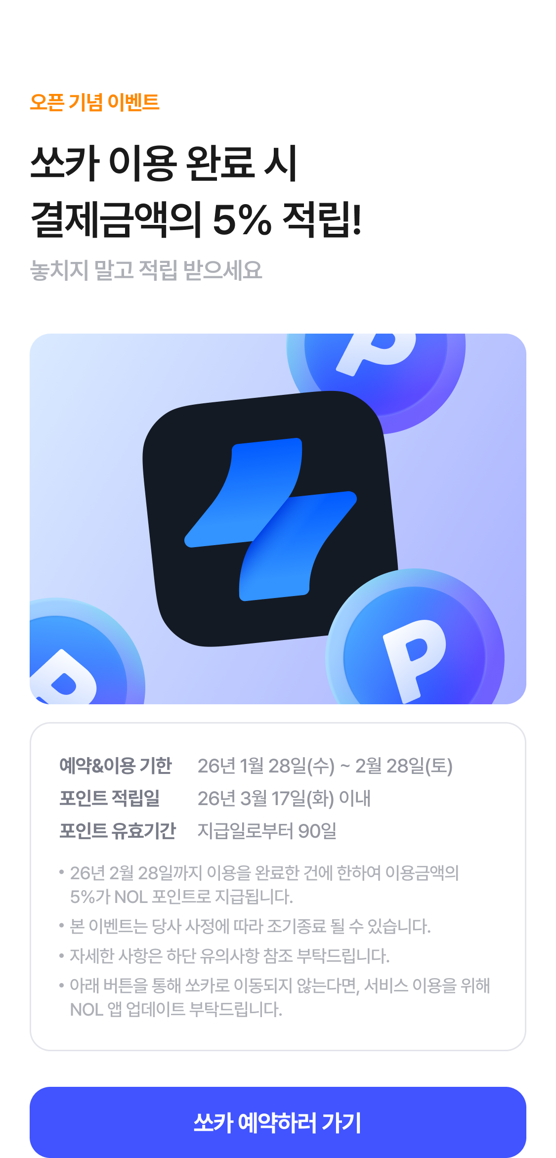 - 쿠폰, 포인트를 제외한 최종 결제 금액의 5%가 NOL포인트로 지급됩니다.