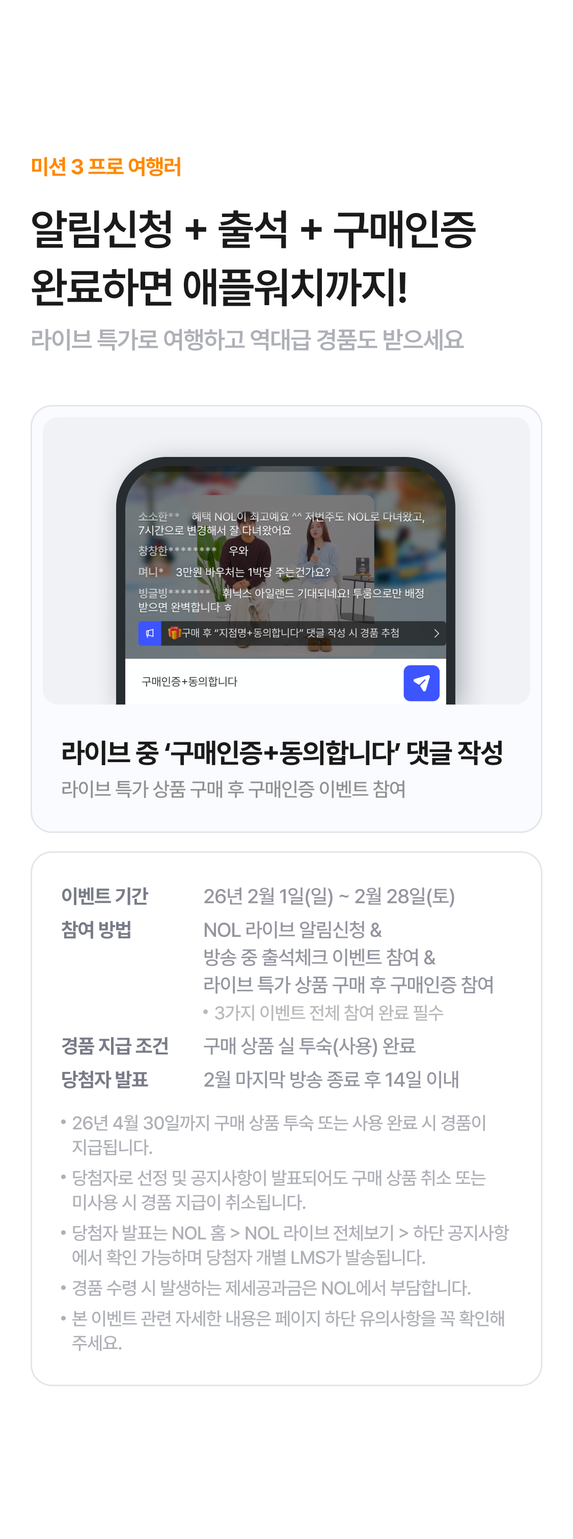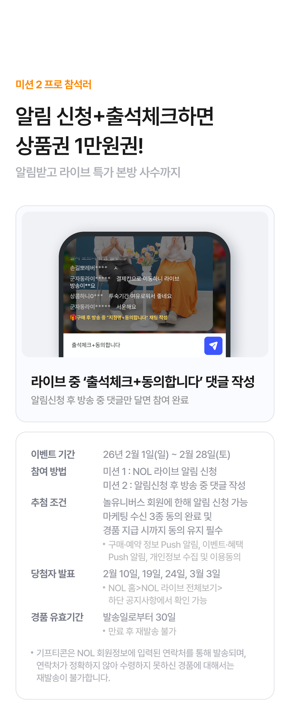 - 본 이벤트의 당첨여부는 2026년 2월 마지막 라이브 방송 종료 후 14영업일 이내 [NOL > NOL live 전체보기 > 공지사항]을 통해 공지되며, 당첨자에게는 별도 당첨 안내 LMS가 발송됩니다.