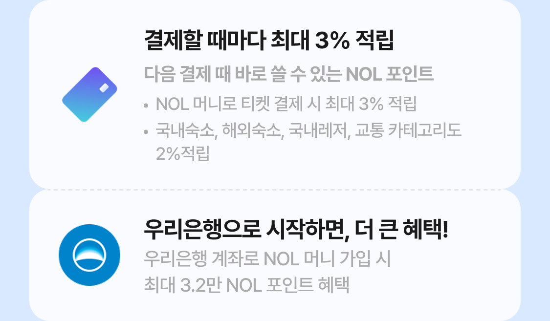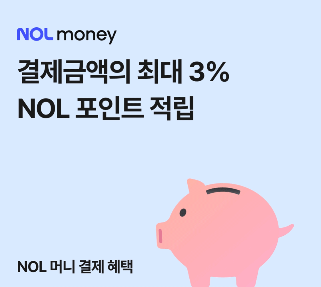 - NOL 티켓 상품은 2/4부터 일부 상품 대상으로 NOL 머니 사용이 가능합니다. (일부 상품에서는 NOL 머니 결제가 불가할 수 있습니다.)
