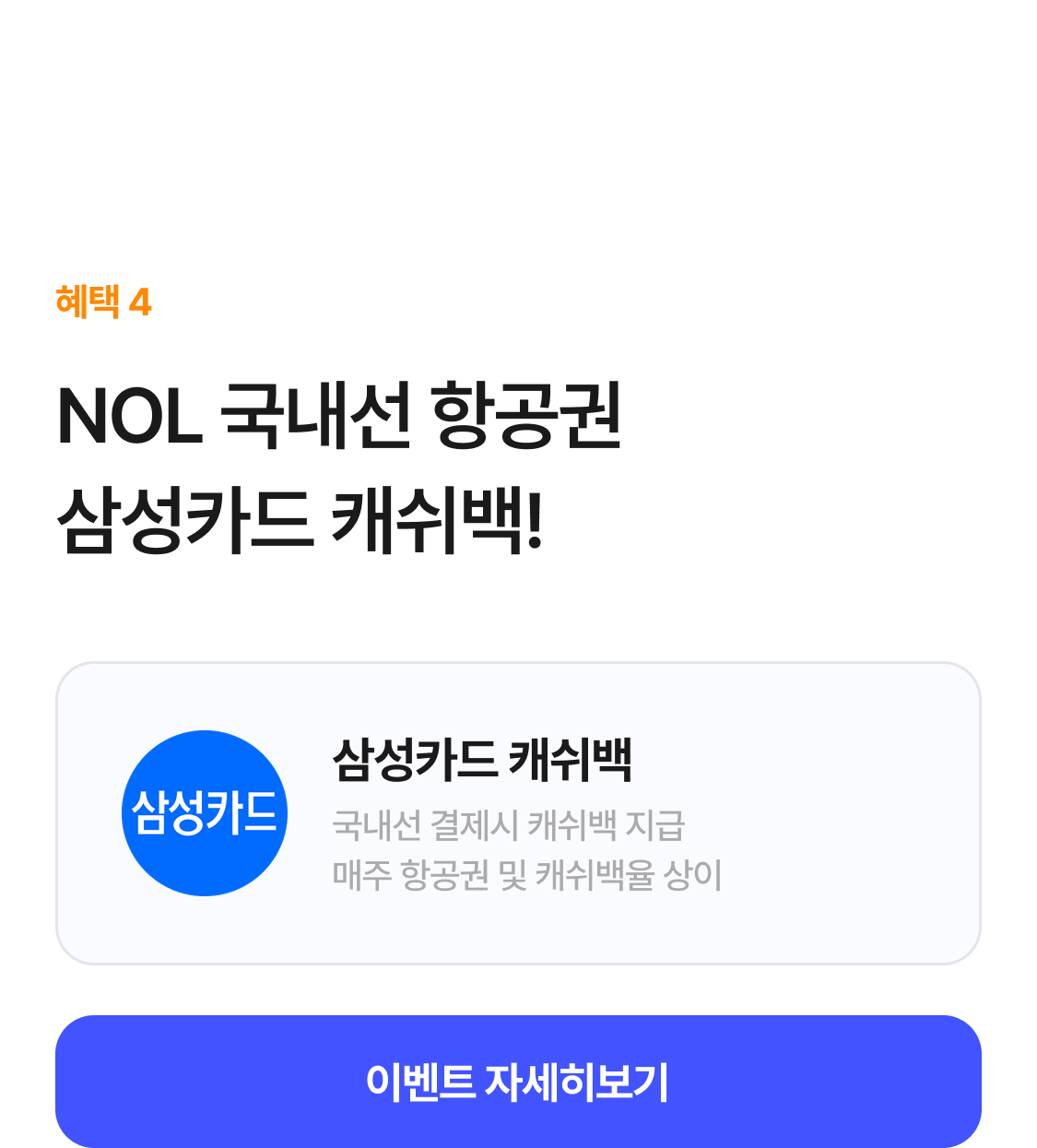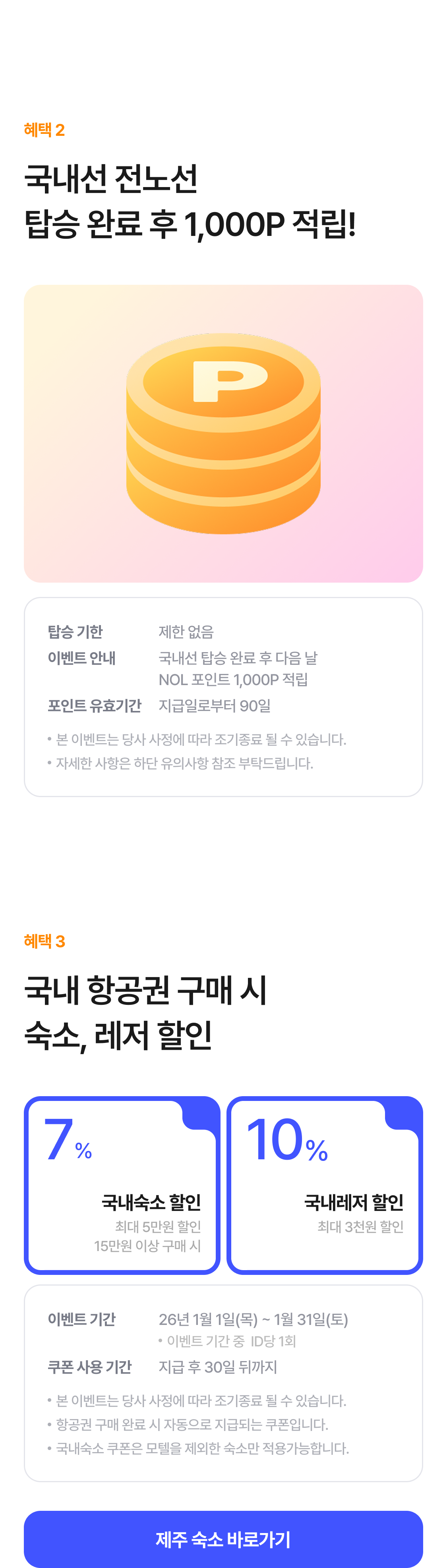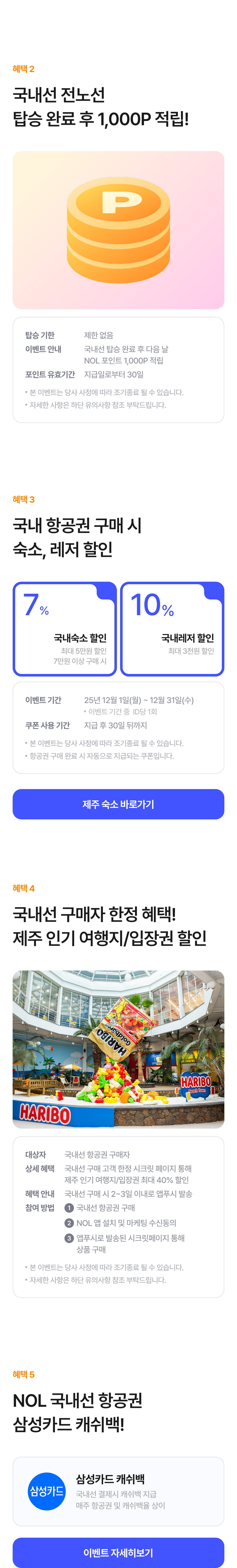 - 포인트 혜택 : 국내선 구매 고객이 탑승완료 후 NOL포인트 1,000P 지급 (편도/왕복 구분없음)