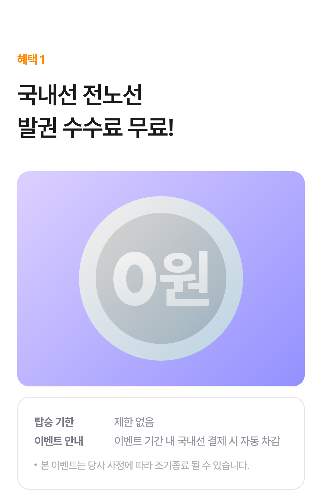 - 이벤트 대상: 이벤트 기간 내 국내선 편도 또는 왕복 항공권을 발권하고, 탑승 기간 내에 모든 탑승을 완료한 고객