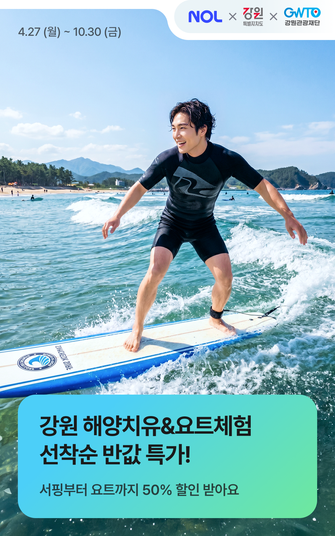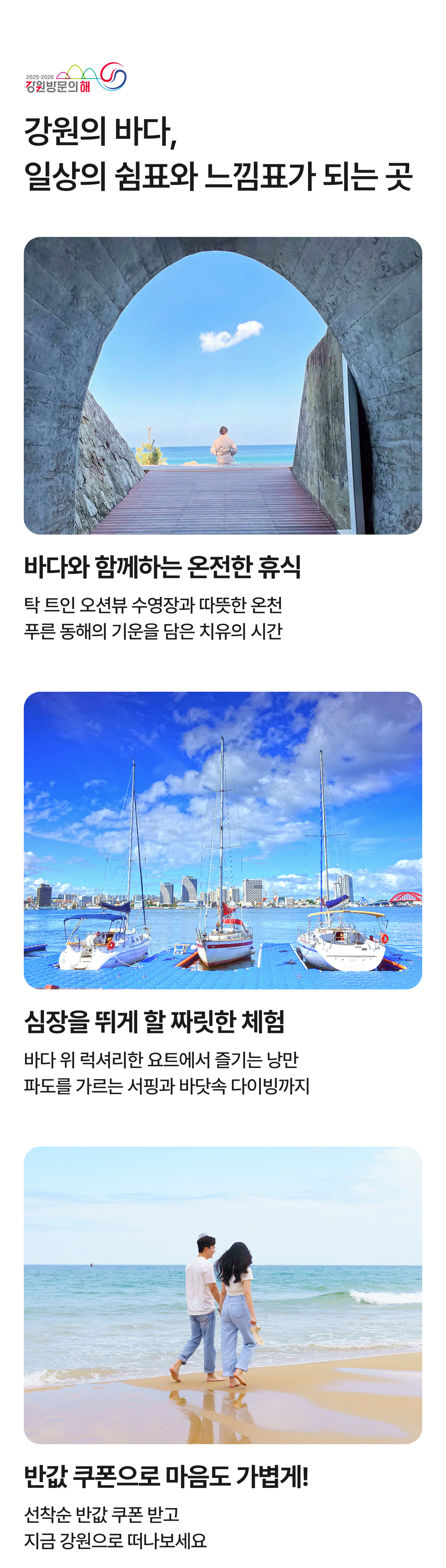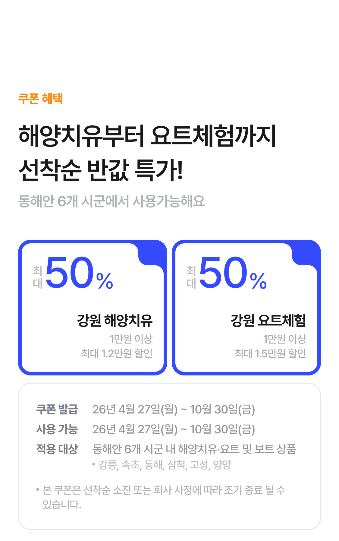 | 강원 해양치유 50% 할인 | 국내레저 | 상품쿠폰 | 강릉, 속초, 동해, 삼척, 고성, 양양 소재 해양치유 레저 상품 | 50% 할인(최대 12,000원) | 2026.04.27. 10:00 ~ 2026.10.30. | 2026.04.27. 10:00 ~ 2026.10.30 | 기간 내 선착순 사용 |