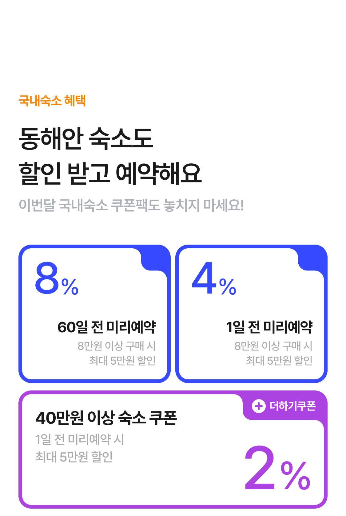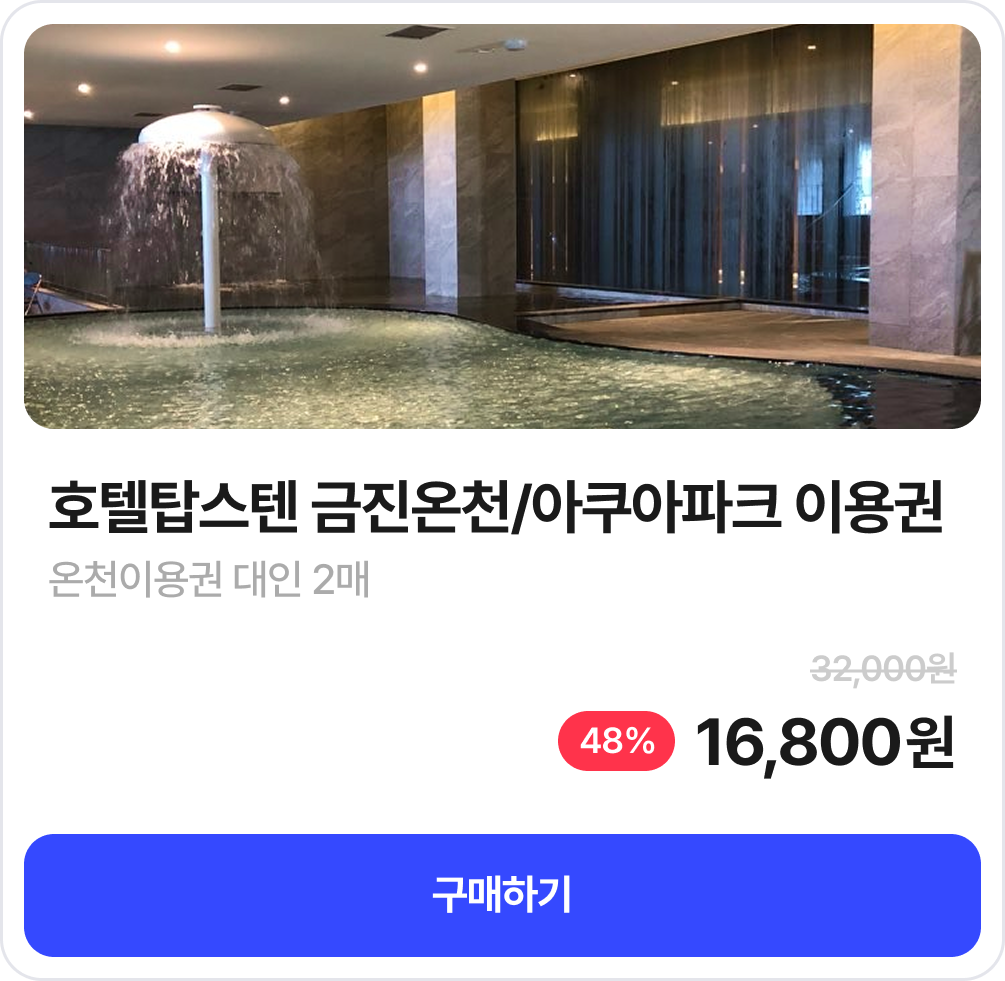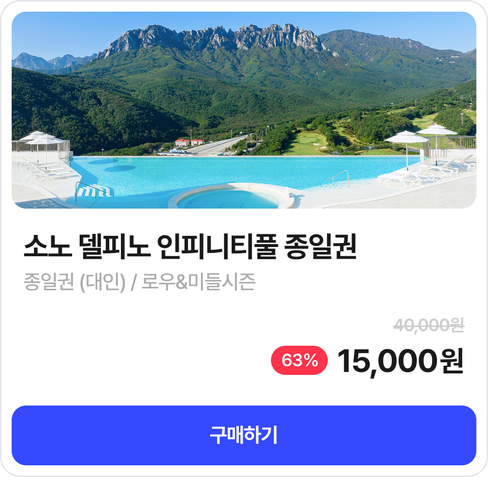 | 강원 해양치유 50% 할인 | 국내레저 | 상품쿠폰 | 강릉, 속초, 동해, 삼척, 고성, 양양 소재 해양치유 레저 상품 | 50% 할인(최대 12,000원) | 2026.04.27. 10:00 ~ 2026.10.30. | 2026.04.27. 10:00 ~ 2026.10.30 | 기간 내 선착순 사용 |
