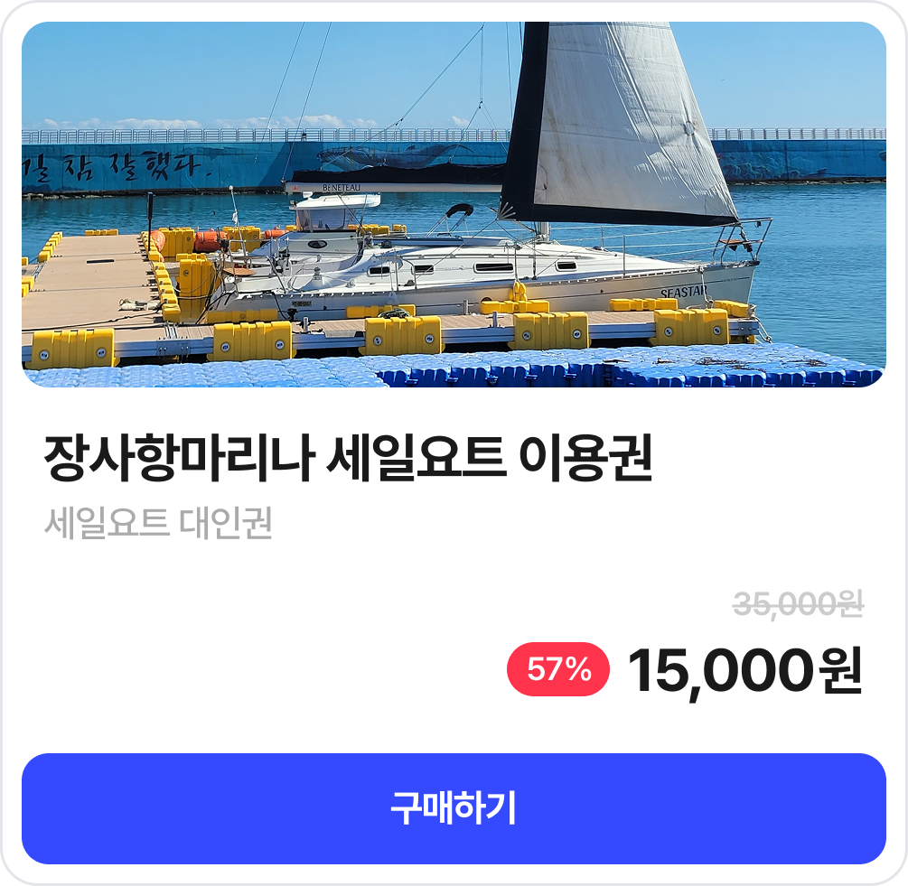 | 강원 요트체험 50% 할인 | 국내레저 | 상품쿠폰 | 강릉, 속초, 동해, 삼척, 고성, 양양 소재 요트체험 레저 상품 | 50% 할인(최대 15,000원) | 2026.04.27. 10:00 ~ 2026.10.30 | 2026.04.27. 10:00 ~ 2026.10.30 | 기간 내 선착순 사용 |