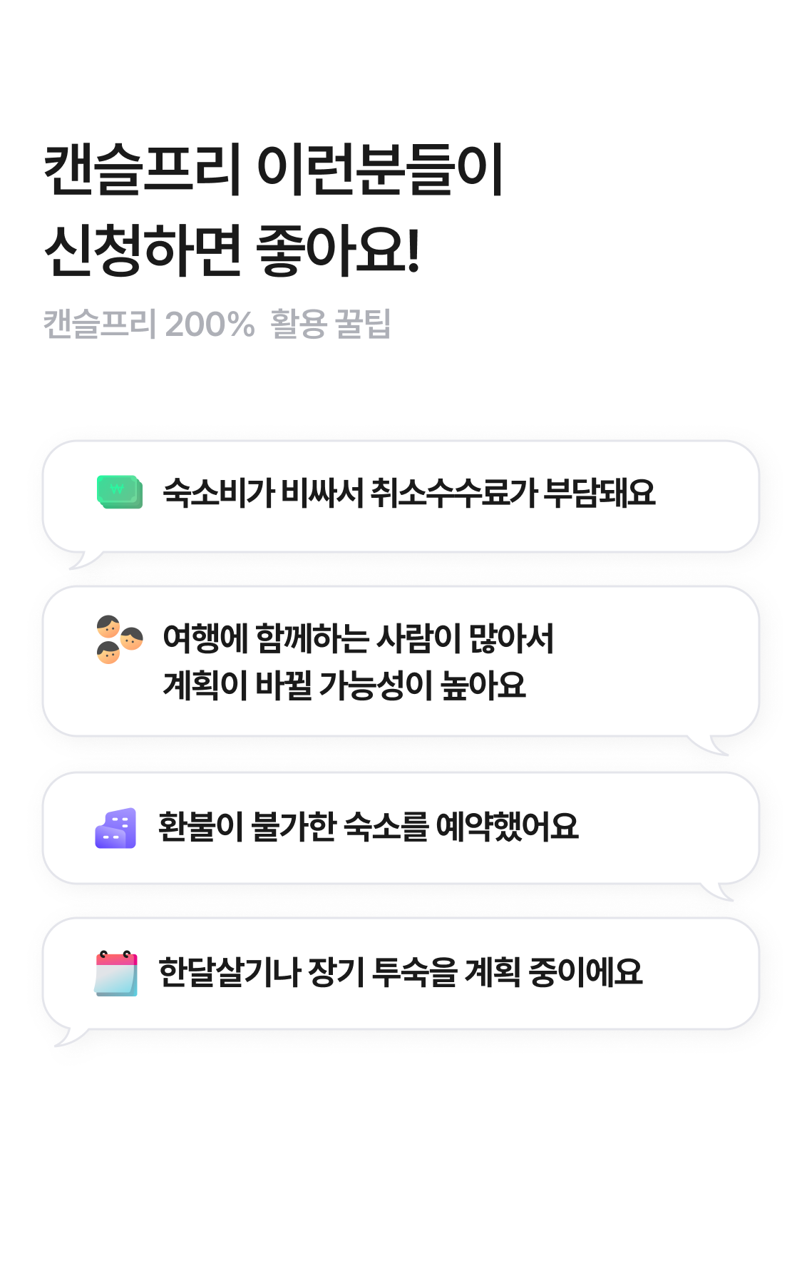 - 캔슬프리 이용에 관한 상세한 내용은 아래 [캔슬프리 이용 및 환불 조건]을 참고 바랍니다.
