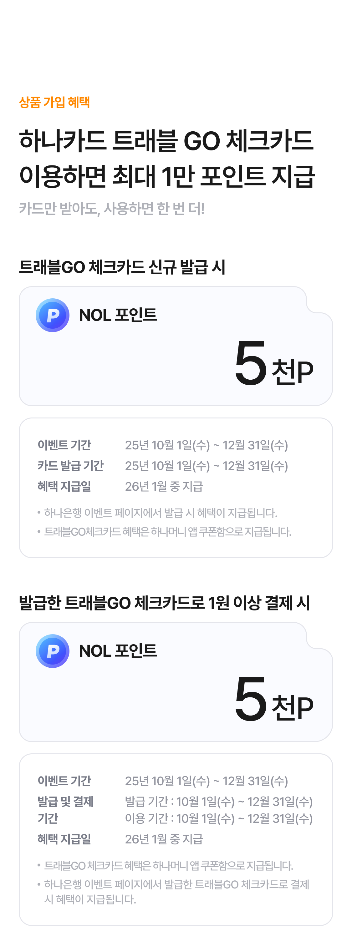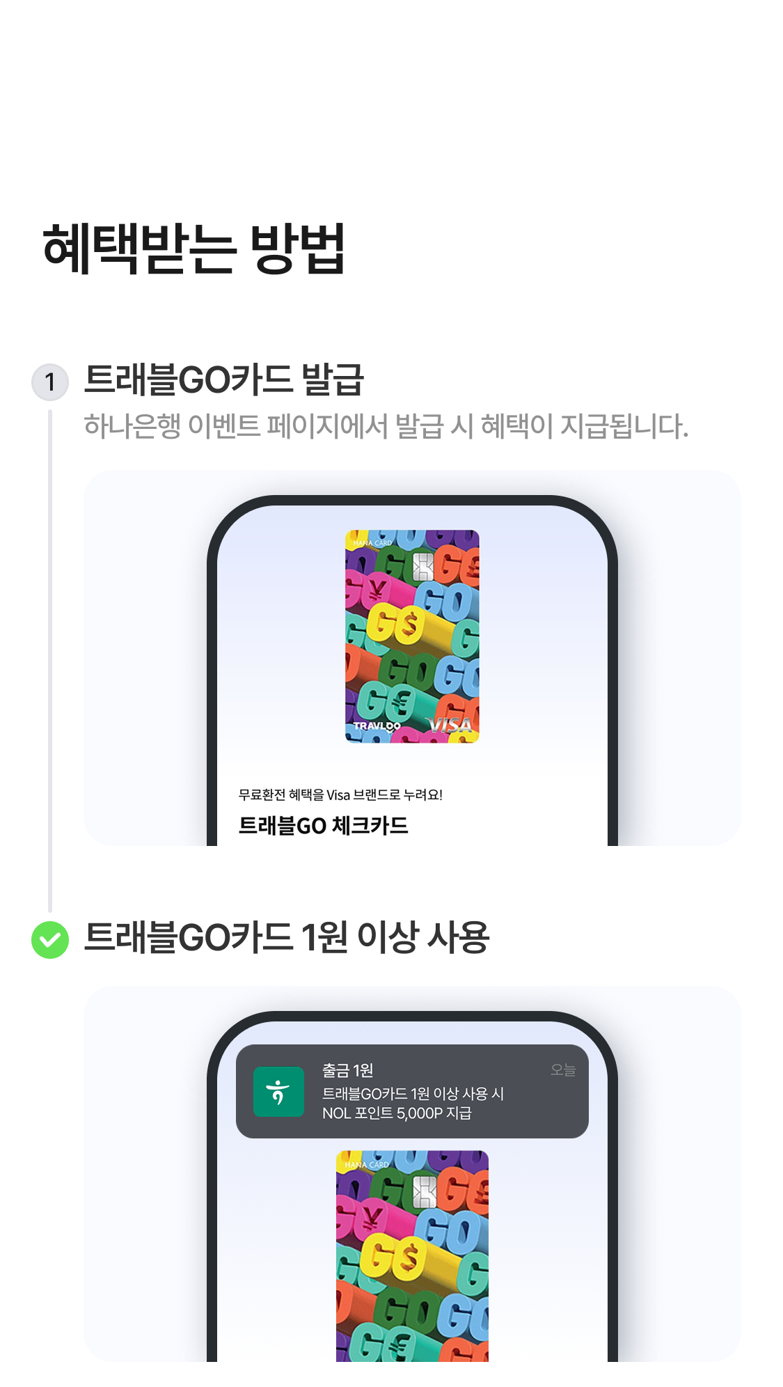 - 발급혜택은 이벤트 기간 내 처음으로 트래블GO 체크카드를 발급받는 경우 제공되며, 이벤트 전 해당 카드를 발급 받았거나 해지한 이력이 있는 경우 대상에서 제외됩니다.