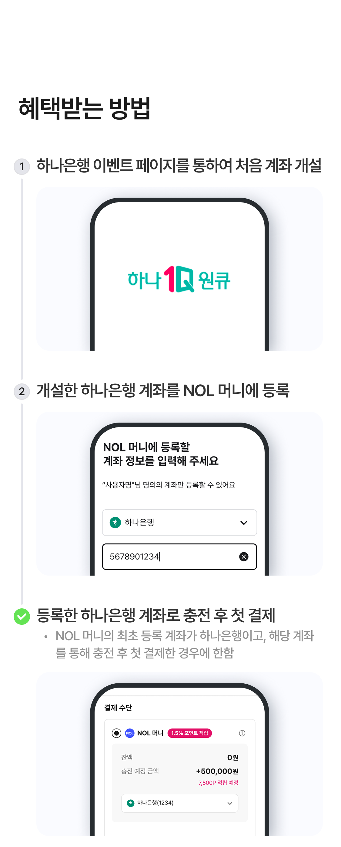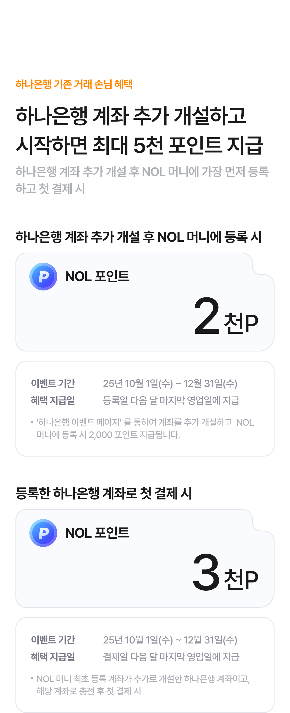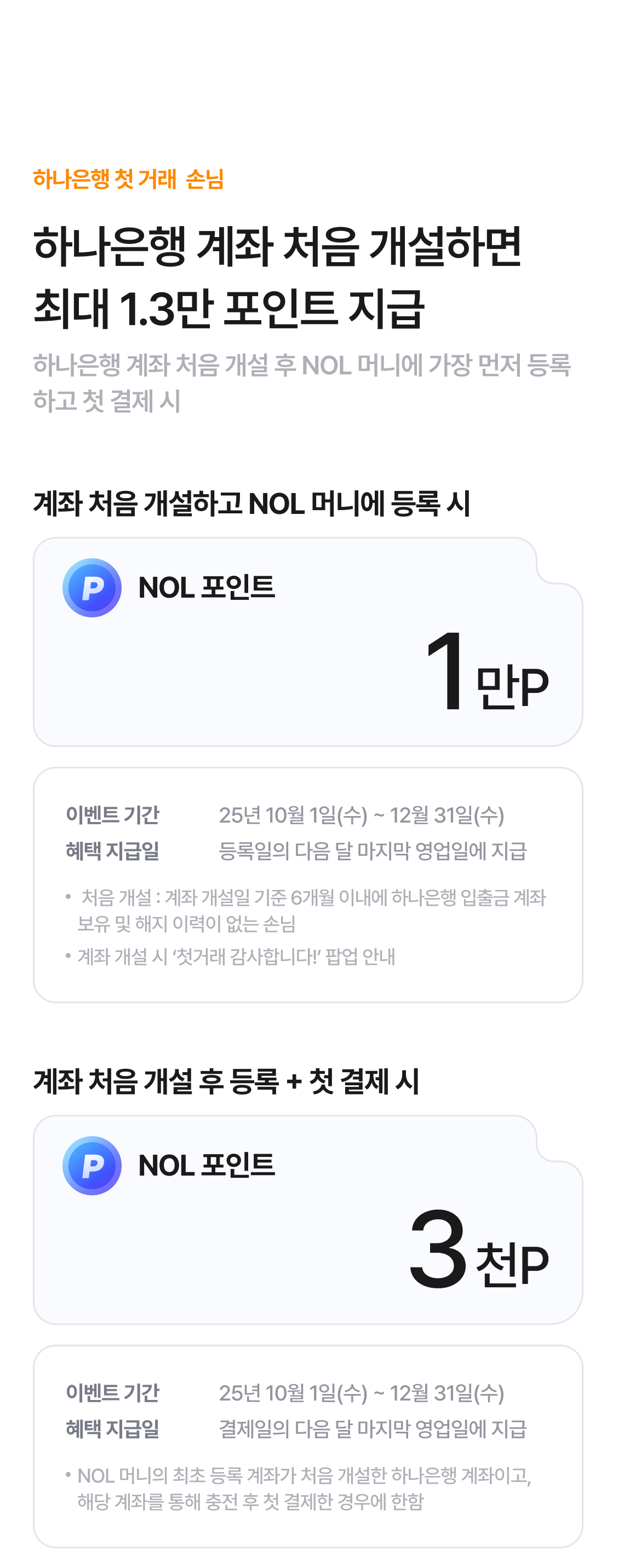 [하나은행 첫 거래 손님 리워드 안내]- 대상: 하나은행 이벤트 페이지에서 처음 계좌를 개설하고 NOL 머니에 등록한 ‘첫 거래 손님’이에요.