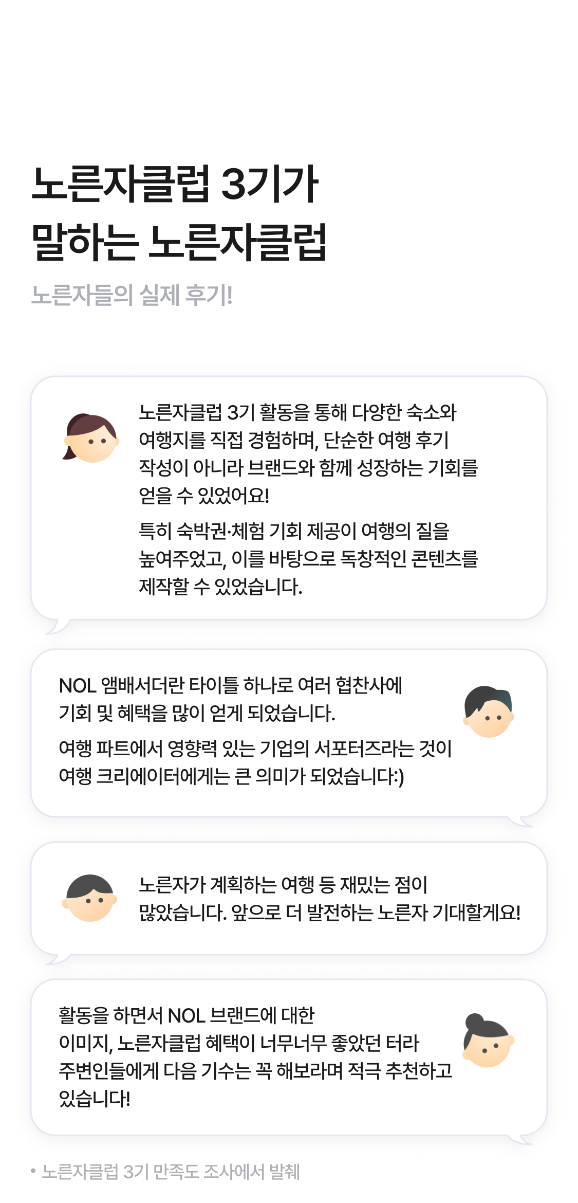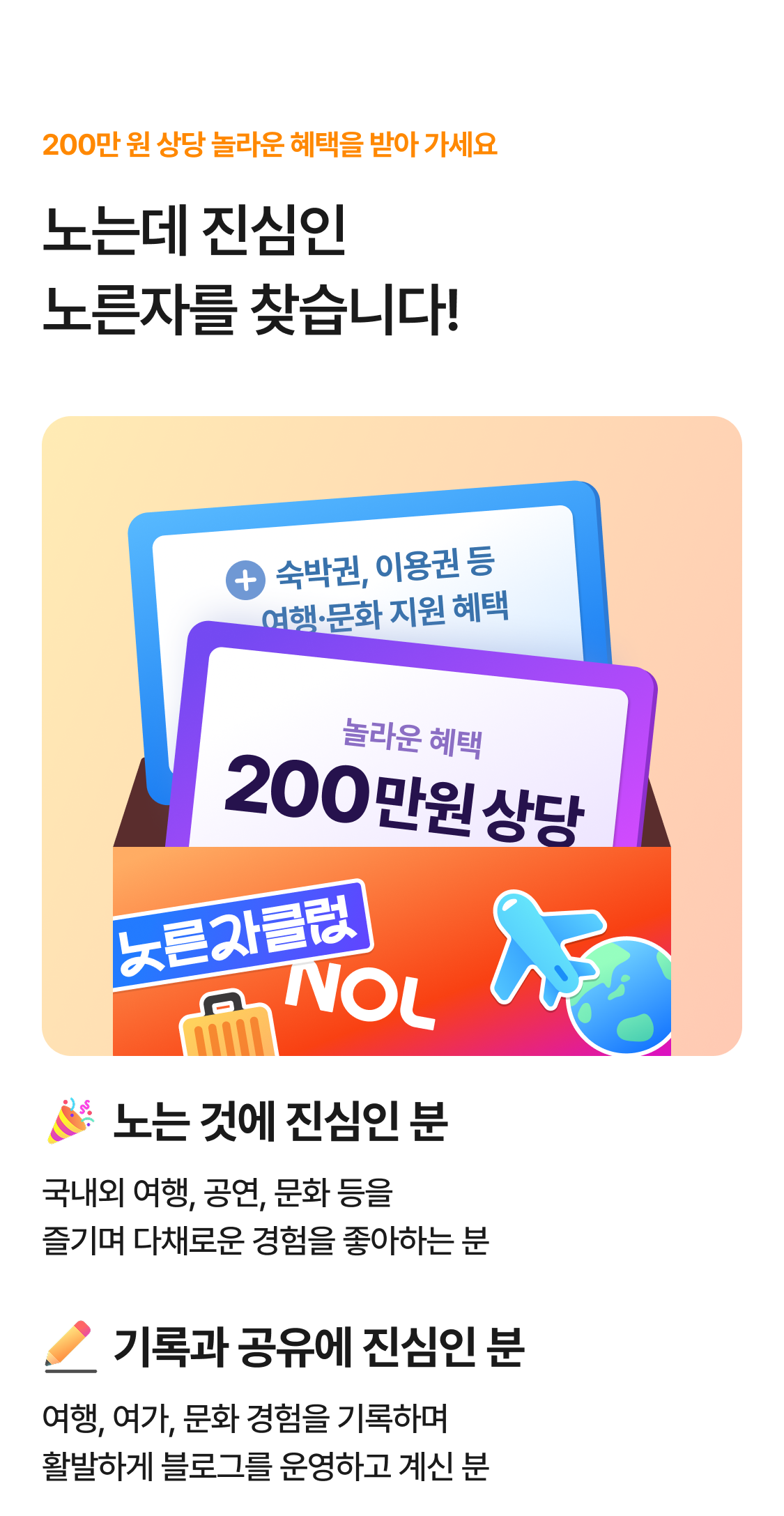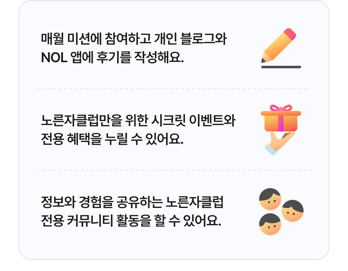 NOL 앱 또는 웹사이트에서 노른자클럽에 제공한 NOL 쿠폰을 사용하여 NOL 여행,여가,문화 상품을 이용 후 개인 SNS 및 NOL 앱 리뷰 콘텐츠 생성하고, 노른자클럽 멤버들과 온/오프라인으로 소통 및 교류하며 정보와 경험을 공유하는 노른자클럽 전용 커뮤니티 활동 진행