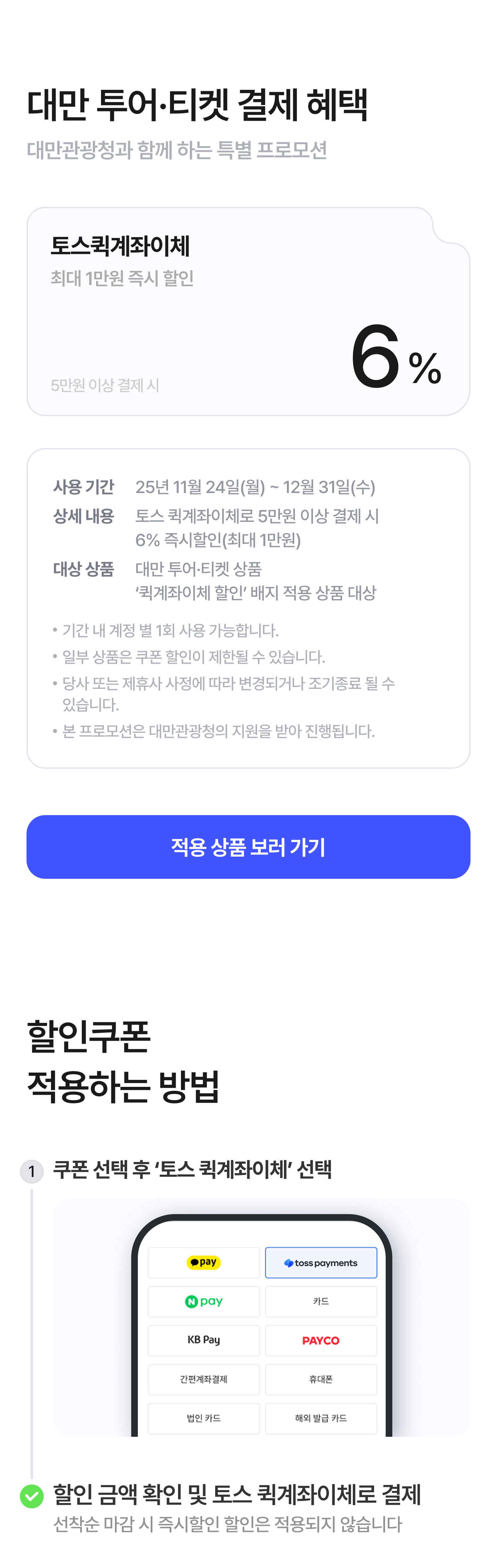 대만 투어티켓 토스 퀵계좌 할인 프로모션