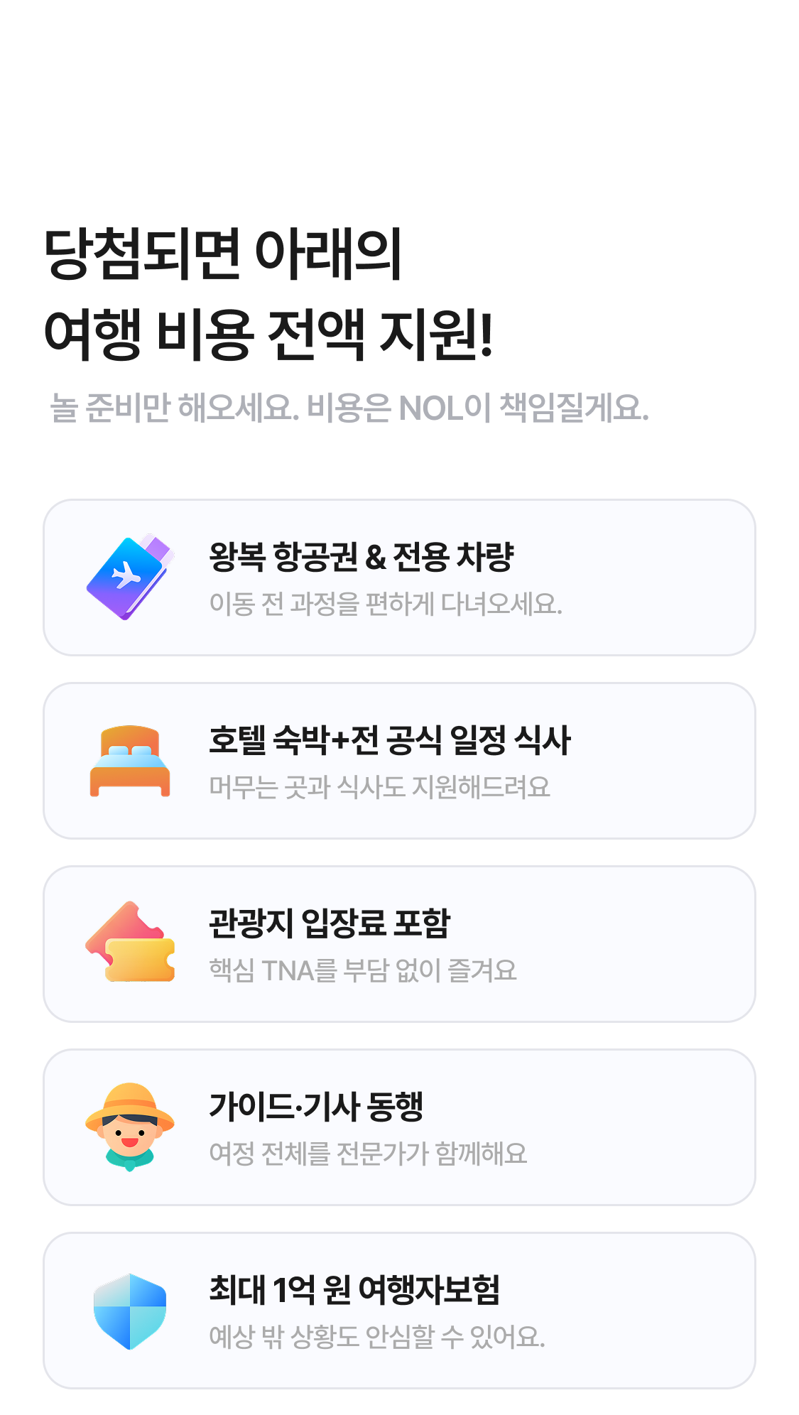 • 당첨자에게 제공되는 여행지원금의 제세공과금(경품 금액의 22%)은 NOL에서 부담하며, 제세공과금 신고 처리 업무를 대행사에 위탁하여 업무를 처리합니다. 대행사는 당첨자 서류 제출 요청 시 안내해드릴 예정이며, 개인정보처리방침 통해서도 확인 가능합니다.