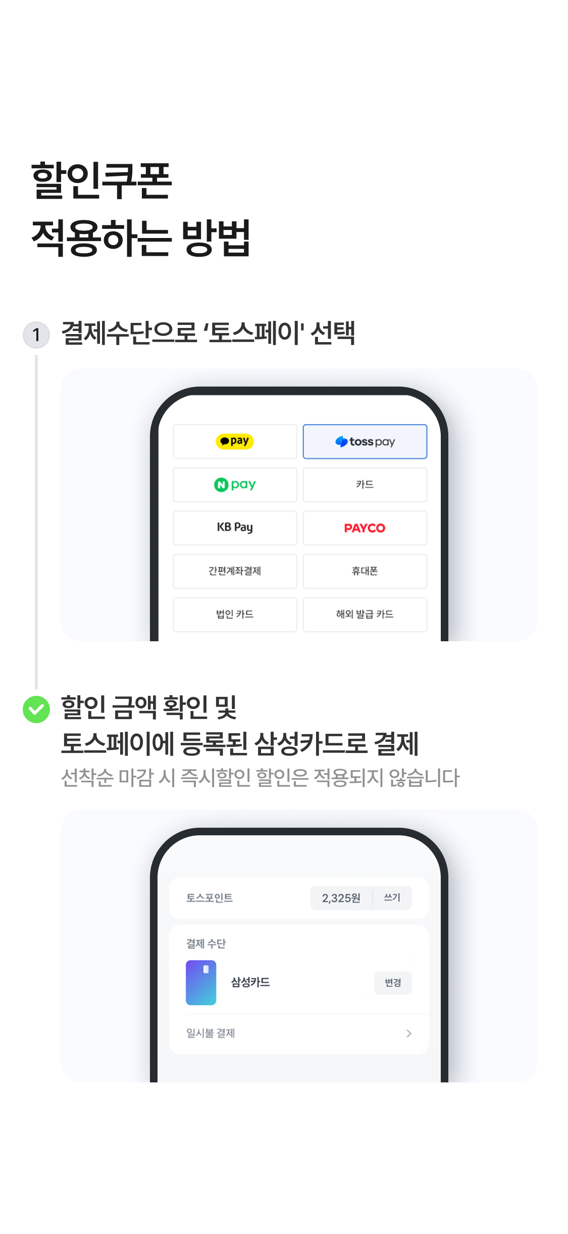토스페이 결제 혜택은 토스페이 내 삼성카드 결제 시에 할인이 적용 됩니다. (법인/선불/기프트/체크/충전카드 제외)