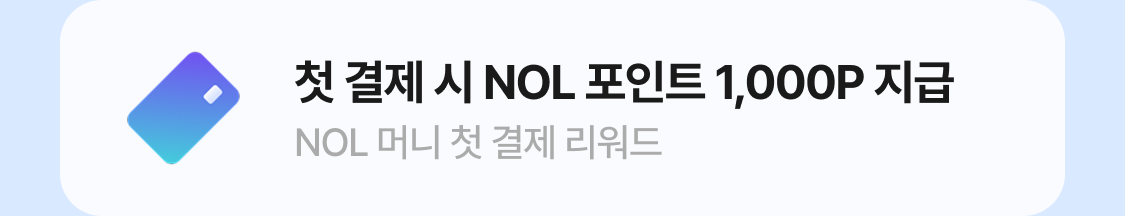 - 첫 결제 1,000P 리워드는 NOL 머니 생애 첫 결제 시 1회만 제공되며, 사용 완료 D+1 기준 즉시 적립돼요.