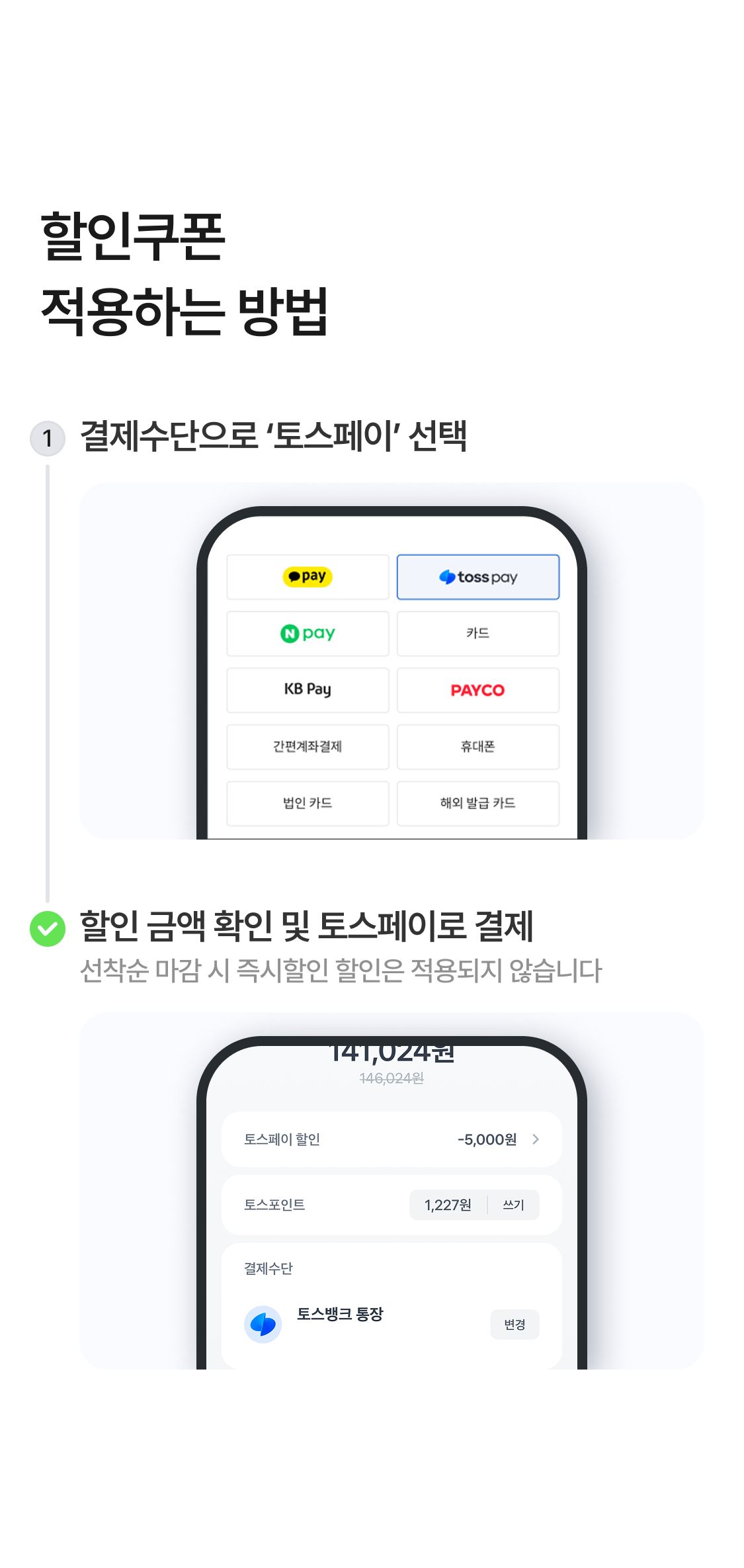 혜택 적용은 토스 앱 내에서 결제 시 자동 적용되며, 최종 결제 전 할인 적용 된 금액을 확인하실 수 있습니다.