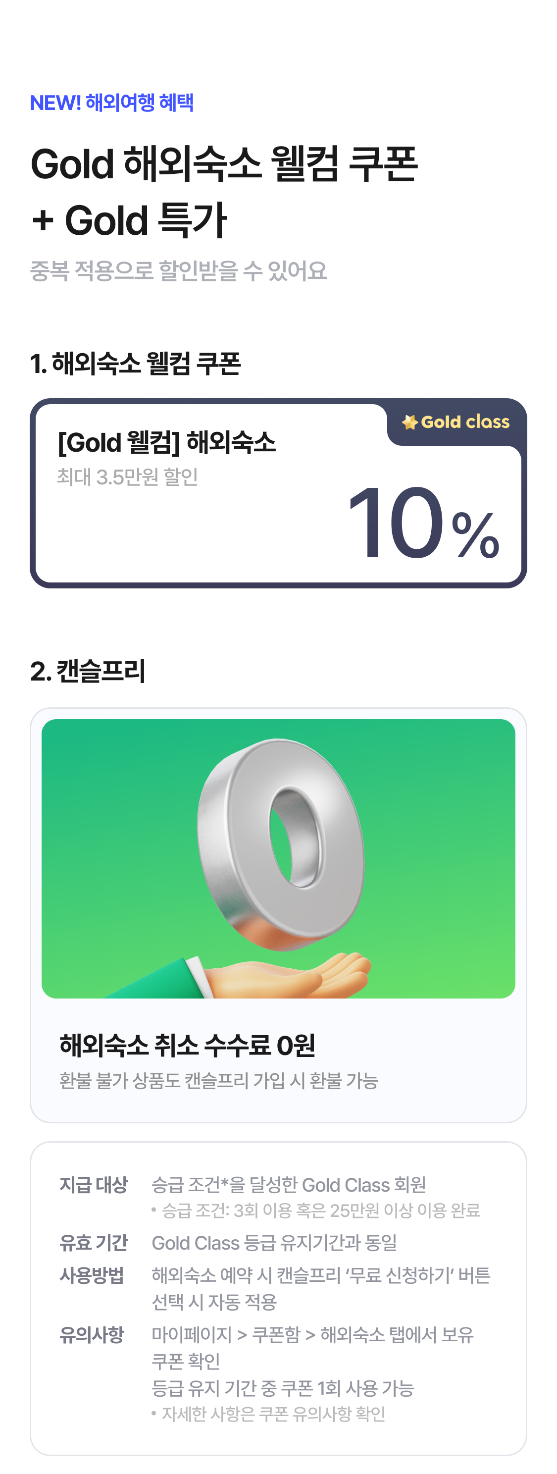| 대상자 조건 해당 시, 마이페이지 > Gold Class 라운지에서 다운로드 | Gold Class 최초 승급 일이 속한 달의 말일까지 |
