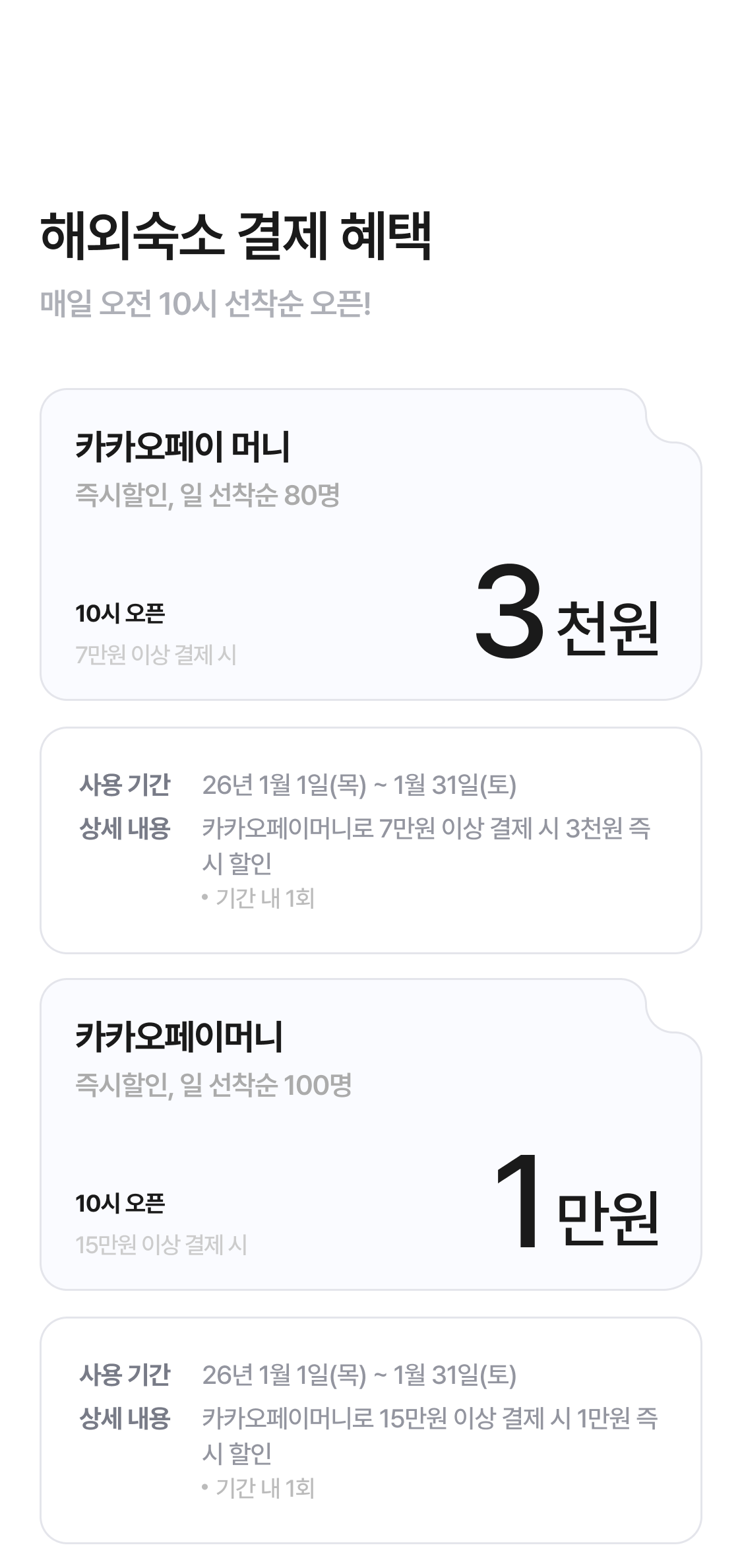 - 본 프로모션 진행 기간은 2026.01.01~01.31 이며, 카카오페이 계정 기준 "구간별 1인 1회, 카카오페이머니 결제"에 한해 할인 적용 가능합니다.