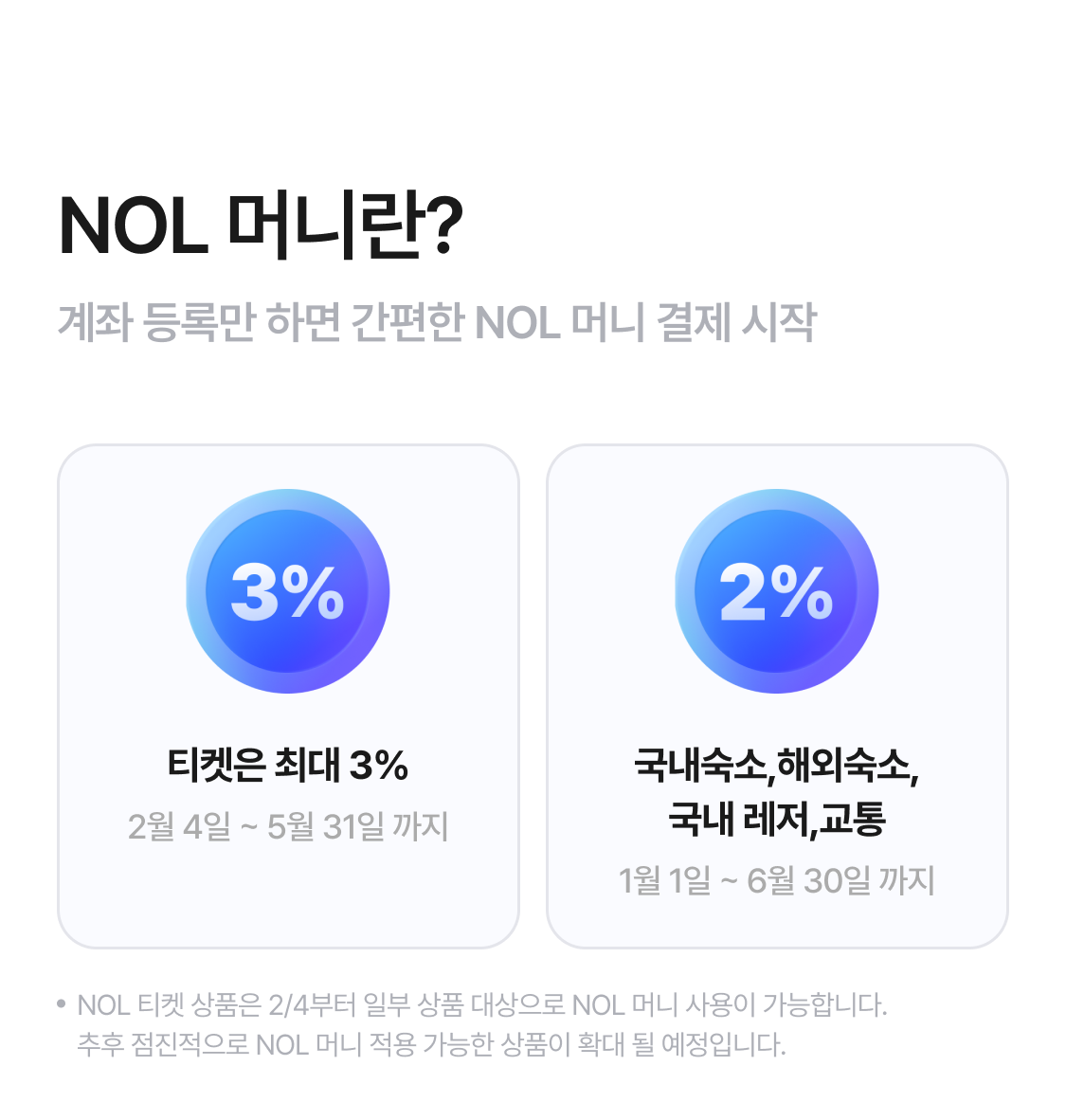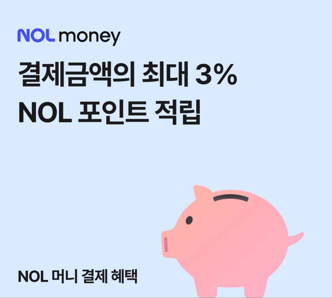 - NOL 티켓 상품은 2/4부터 일부 상품 대상으로 NOL 머니 사용이 가능합니다. 추후 점진적으로 NOL 머니 적용 가능한 상품이 확대 될 예정입니다.