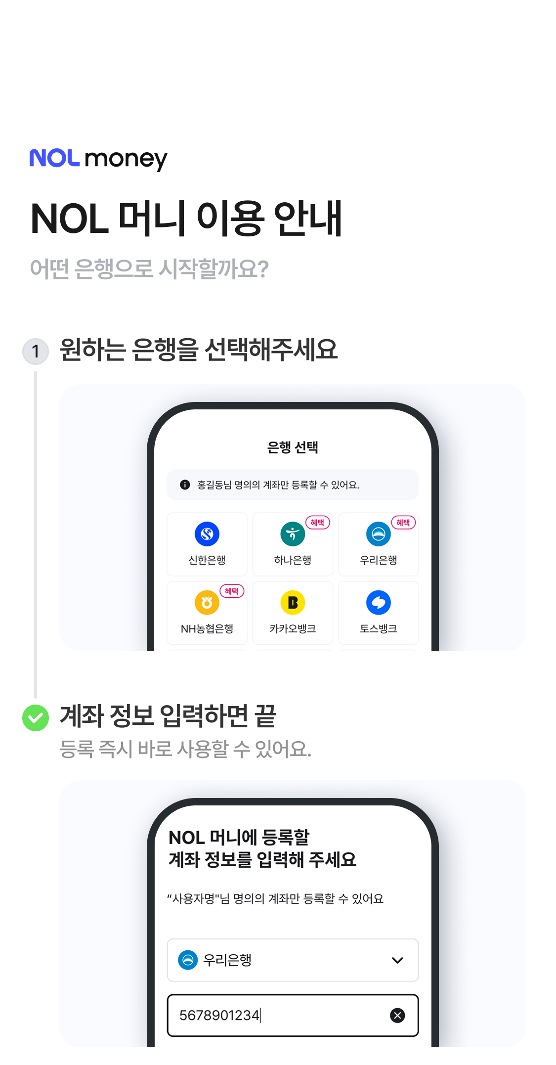 - 본인 명의 계좌 연결을 통해 충전할 수 있어요.