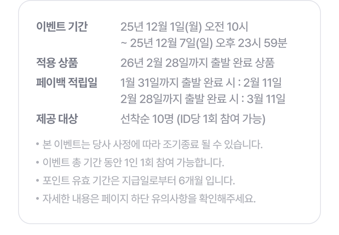 - 본 프로모션은 회사 사정에 따라 변경되거나 조기 종료될 수 있으며, 변경 및 종료에 관한 내용은 공지사항을 통해 안내됩니다.