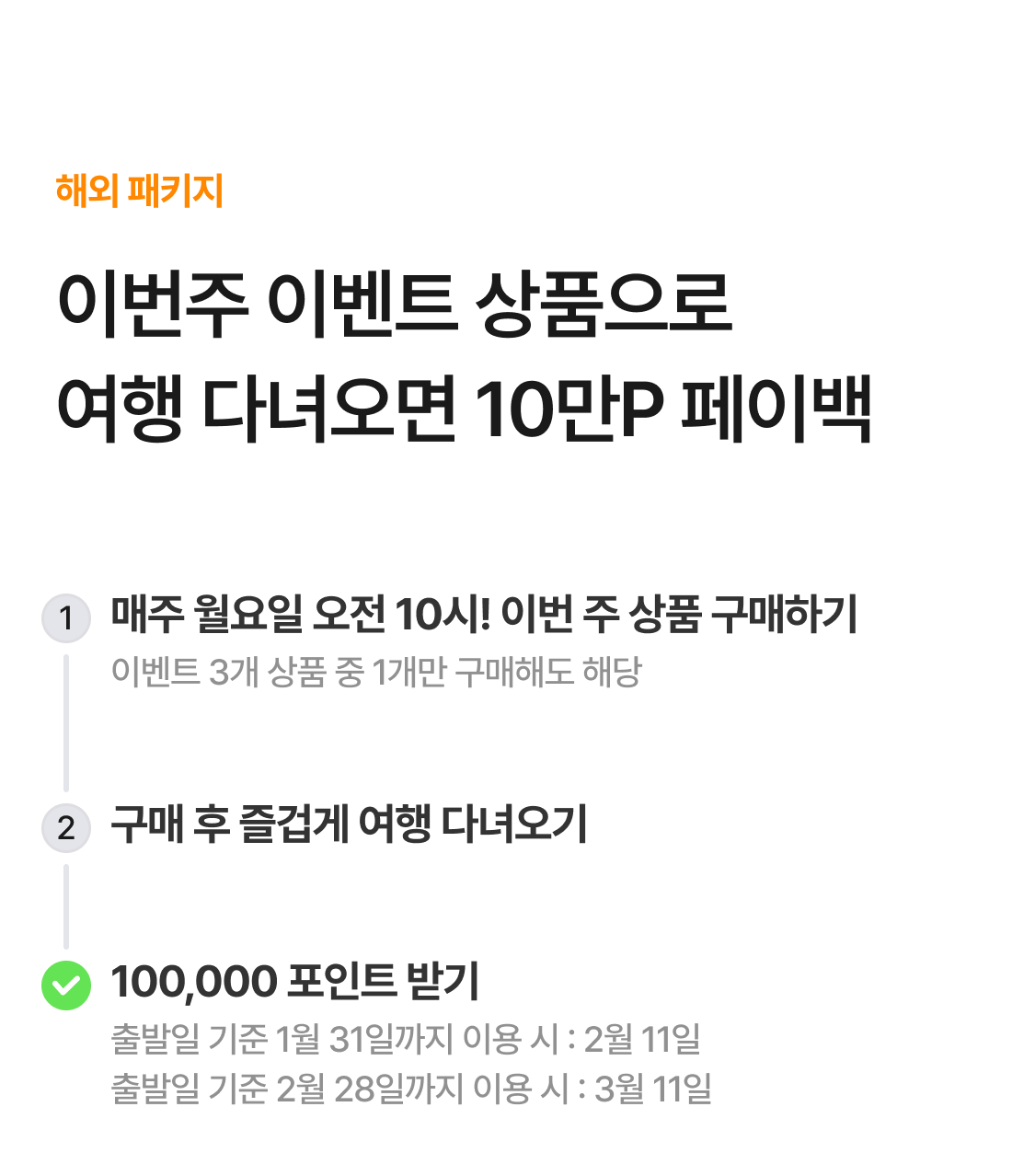 c. 구매한 해외 패키지 상품을 2026.02.28 기간 내 이용 완료한 고객 주차별 선착순으로 10명 선정하여 NOL포인트 지급 (총 5주간 총 50명 선정)