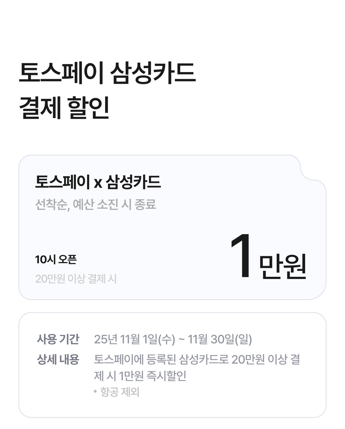 토스페이 결제 혜택은 토스페이 내 삼성카드 결제 시에 할인이 적용 됩니다. (법인/선불/기프트/체크/충전카드 제외)