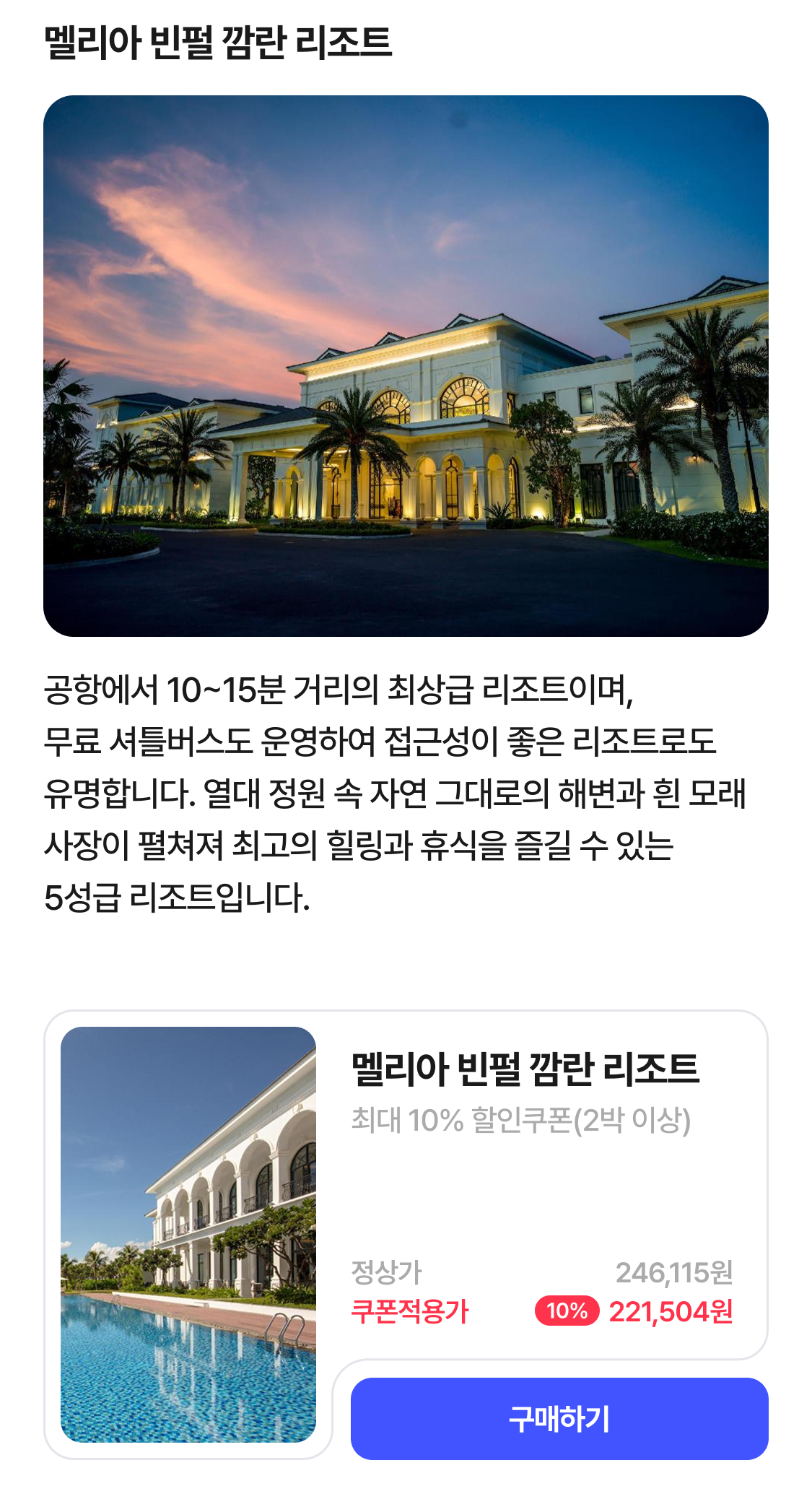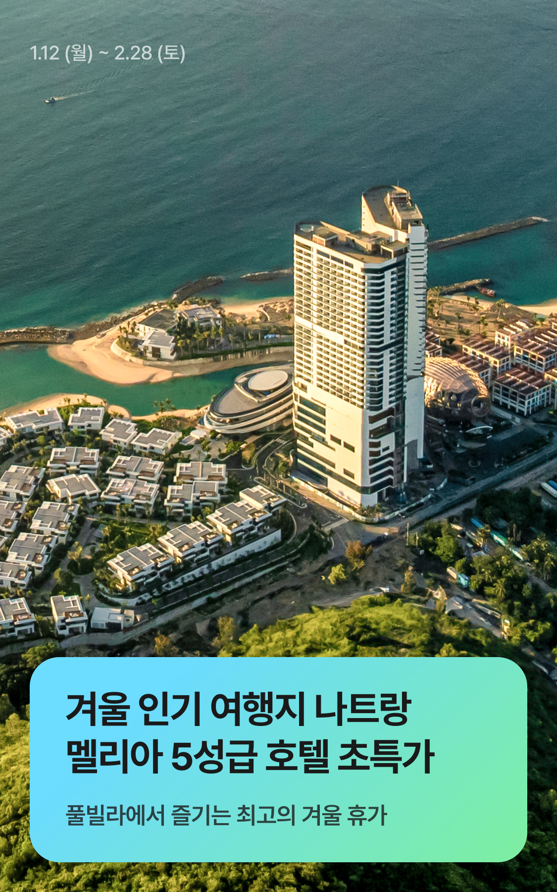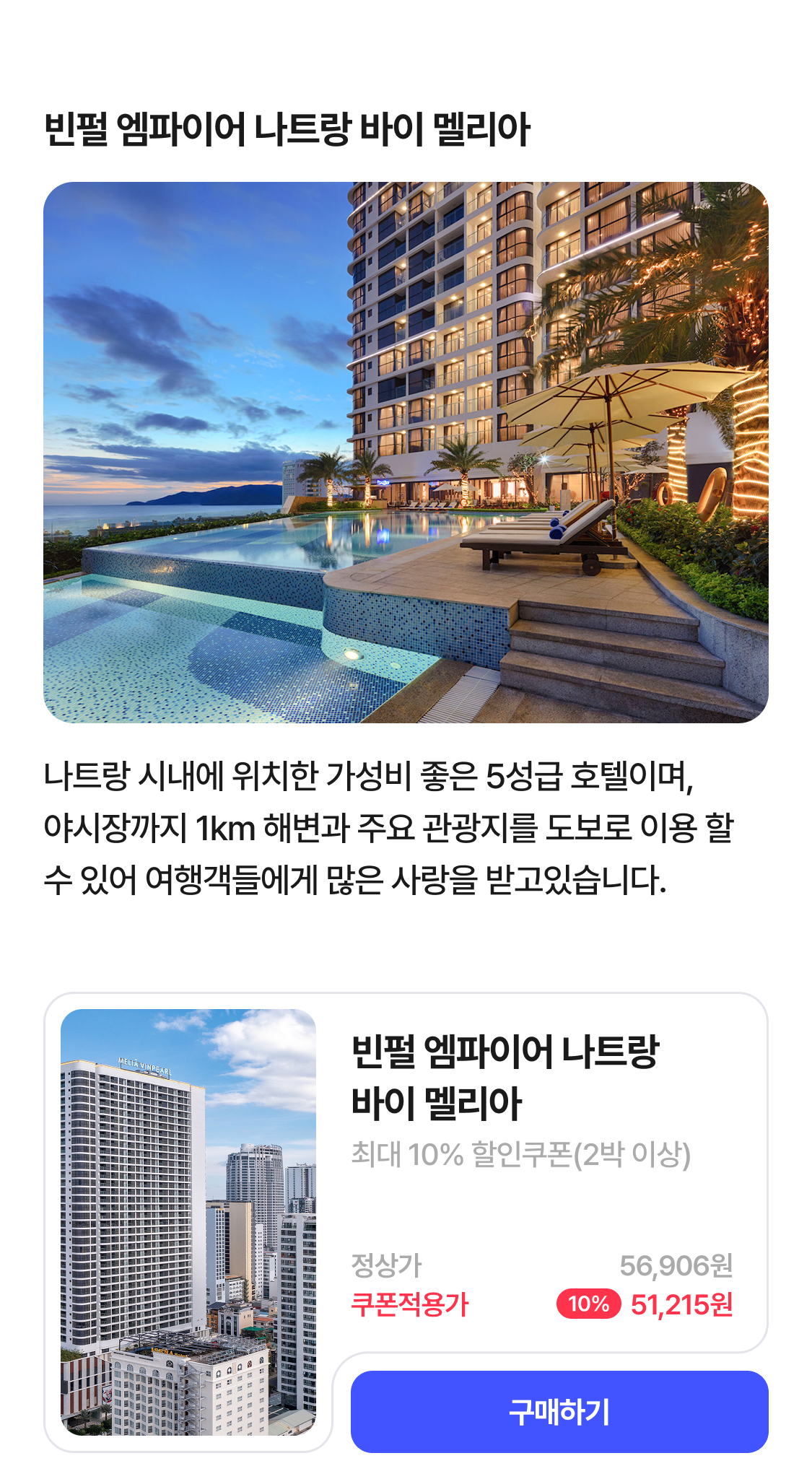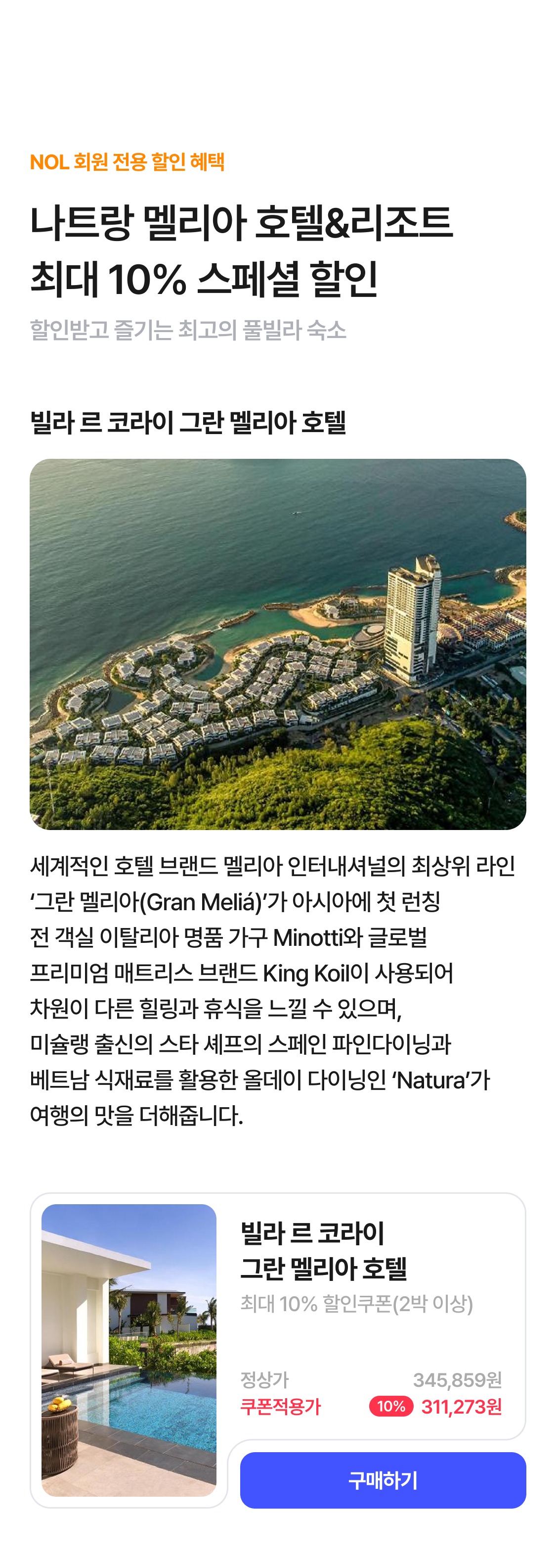 | 나트랑 추천숙소 10% 할인 | 10% 할인(최대 60,000원) | ∘ 투숙기한 제한없음 ∘ 2이상 결제시 적용 ∘ 적용 상품 : 빌라 르 코라이 그란 멜리아, 빈펄 엠파이어 나트랑 어필리에이티드 바이 멜리아, 멜리아 빈펄 깜란 리조트 ∘ 발급 당일 23:59분까지 사용가능 |