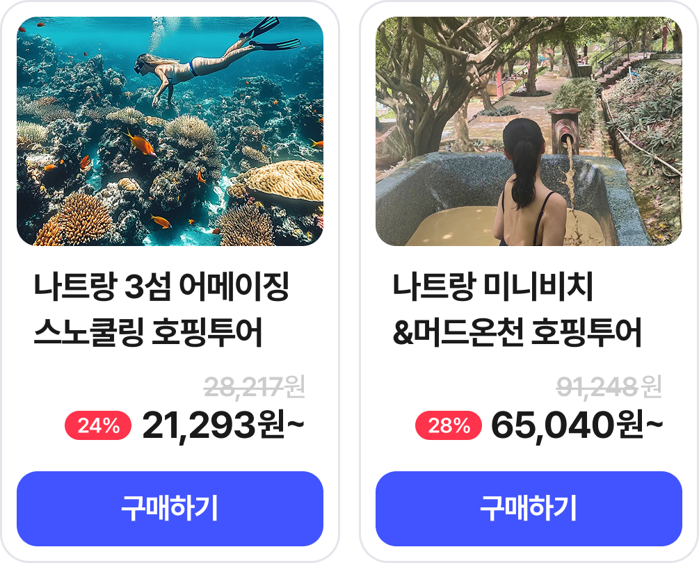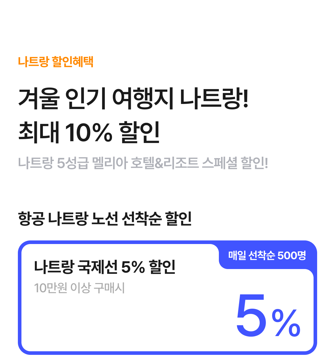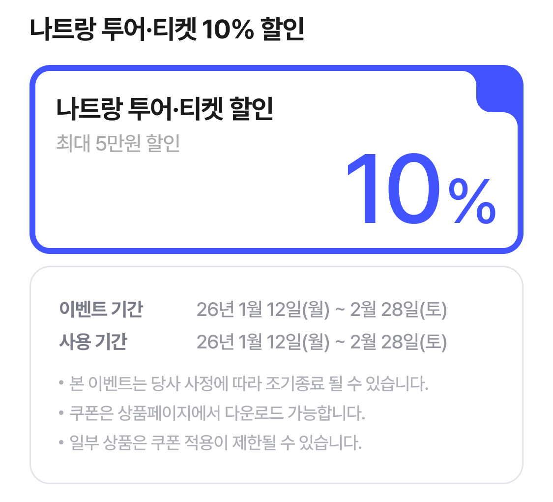 | 국제선 나트랑 5% 할인쿠폰 | 5% 할인(최대 10만원 할인) | ∘ 상품 판매가
