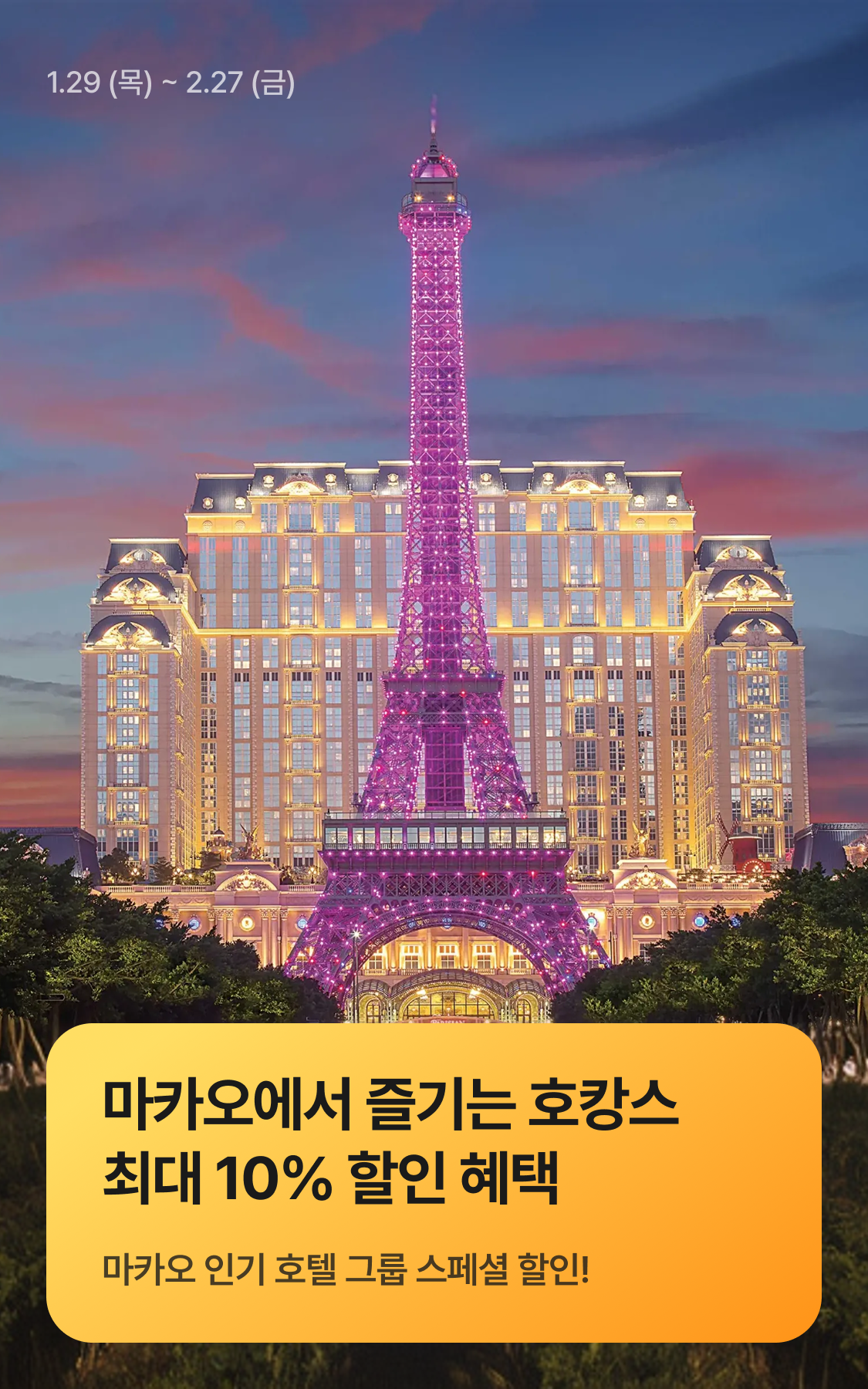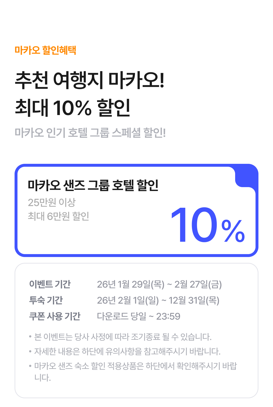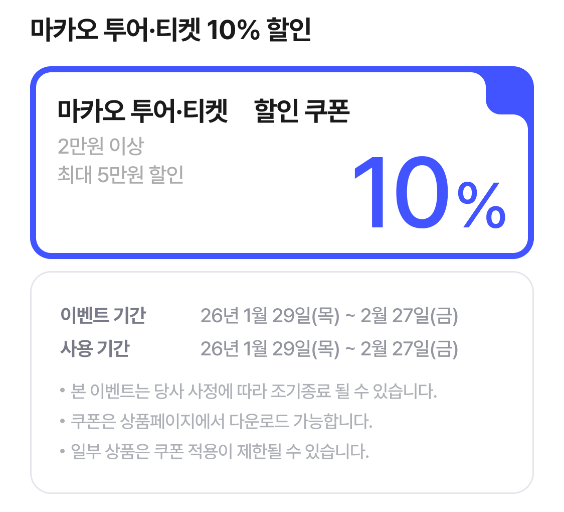 | 마카오 투어·티켓 8% 할인 | 8% 할인(최대 50,000원) | ∘ 2만원 이상 결제시 적용∘ 쿠폰 사용기간: 2026년 1월 29일 (목) - 2월 27(금)∘ 쿠폰은 상품페이지에서 다운로드 |