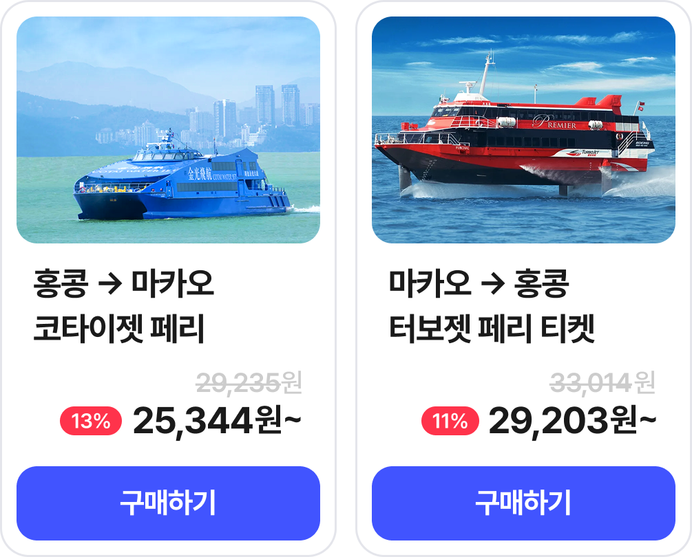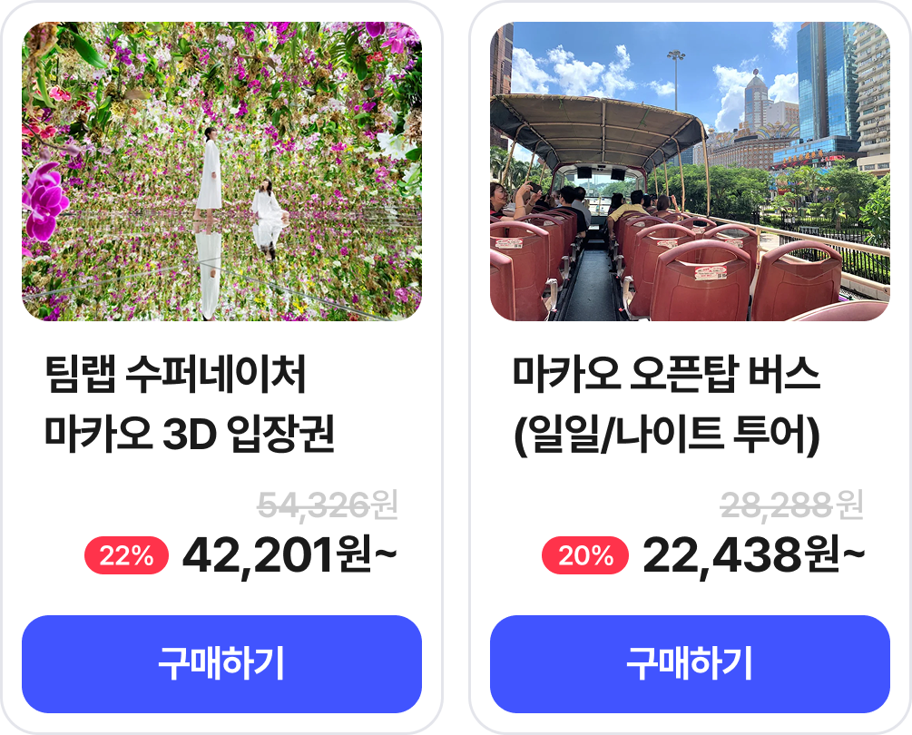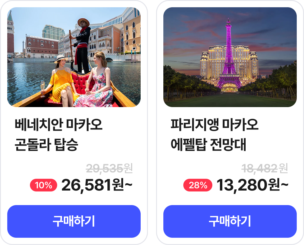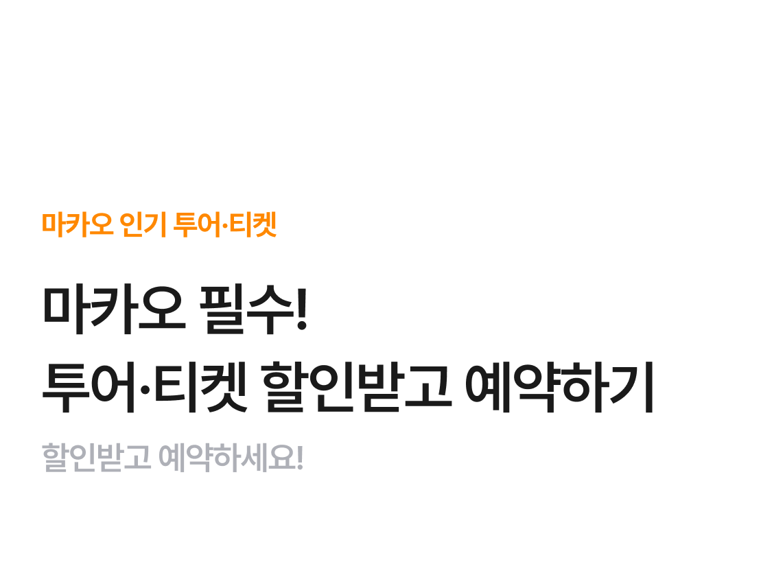 | 마카오 투어·티켓 8% 할인 | 8% 할인(최대 50,000원) | ∘ 2만원 이상 결제시 적용∘ 쿠폰 사용기간: 2026년 1월 29일 (목) - 2월 27(금)∘ 쿠폰은 상품페이지에서 다운로드 |