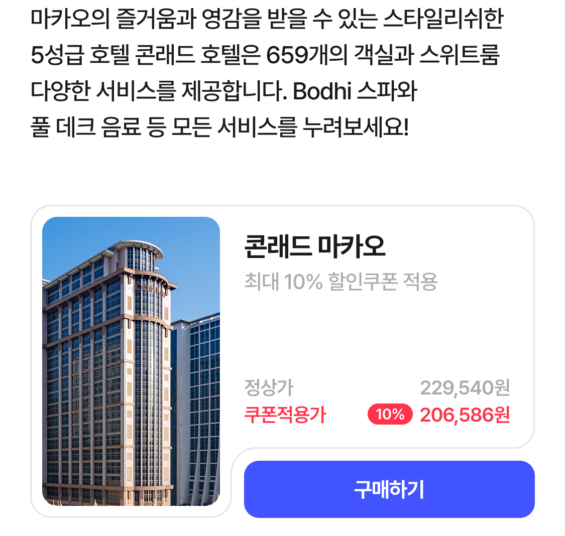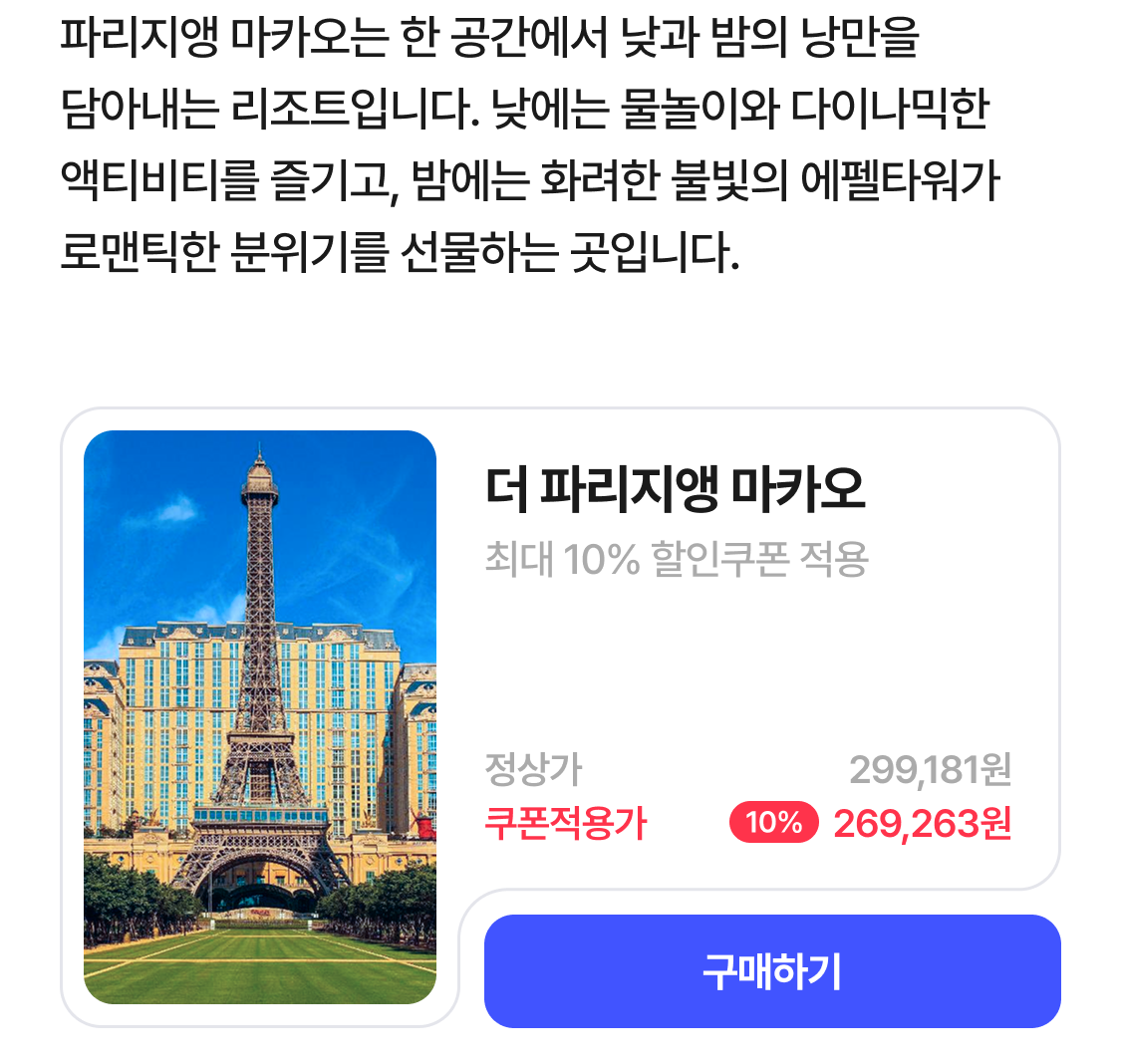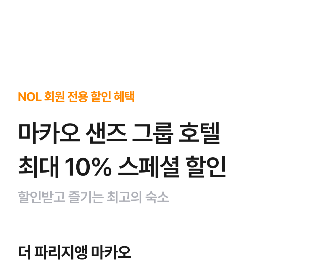| 마카오 샌즈 그룹 호텔 10% 할인쿠폰 | 10% 할인(최대 60,000원) | ∘ 투숙기한 :2026년 2월 1일 (일) - 12월 31(목)∘ 25만원 이상 결제시 적용∘ 적용 상품 : 런더너 그랜드 럭셔리 컬렉션 마카오,더 파리지안 마카오,더 베네치안 마카오,콘래드 마카오더 런더너 호텔∘ 발급 당일 23:59분까지 사용가능 |