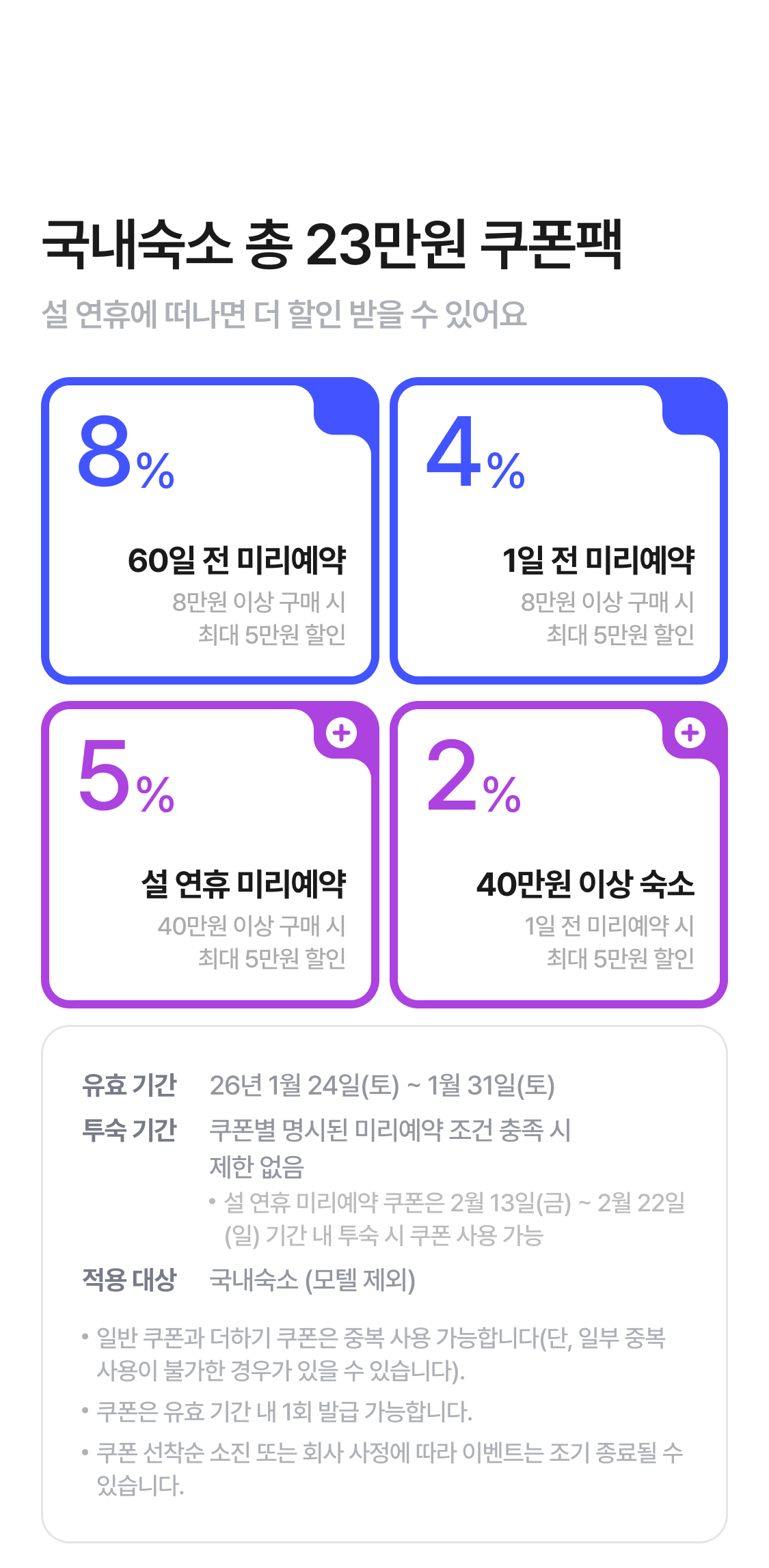 | 설 연휴 미리예약 5% 더하기 할인 | 5% (최대 5만원) |