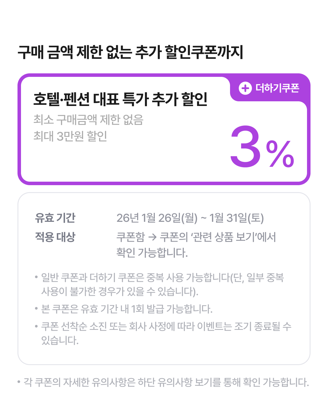 | 해외숙소 8% 할인쿠폰 | 8% 할인(최대 130,000원) |