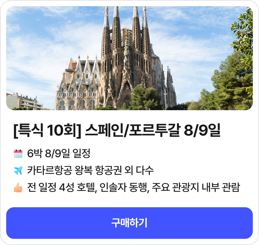 결제시 적용∘ 매일 오전 10시, 선착순 100명 발급∘ 발급 당일 23:59분까지 사용가능∘ 적용 국가 : 영국, 프랑스, 이탈리아, 스페인, 포르투갈 (단, 국내 출발 항공편에 한함) |