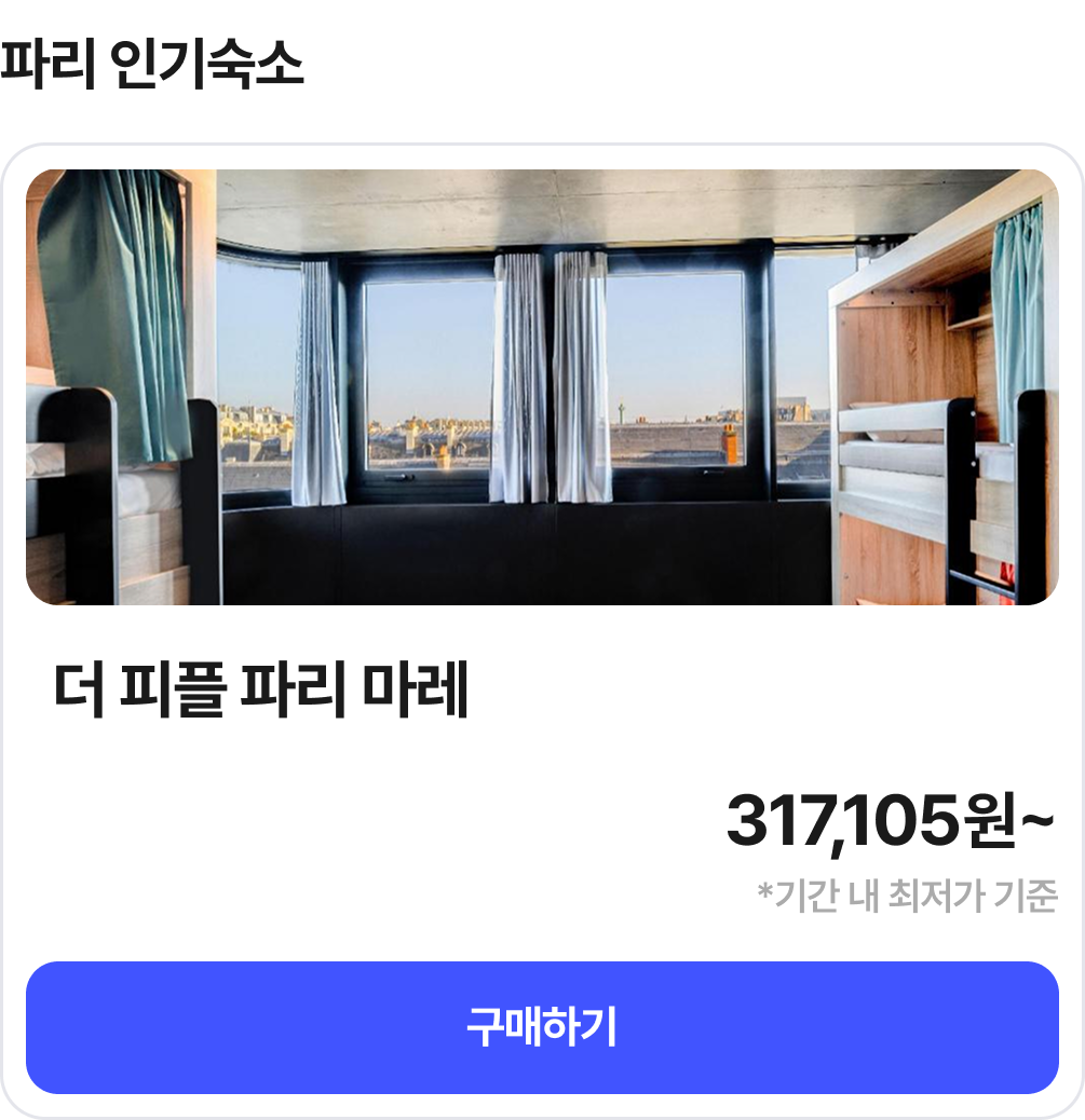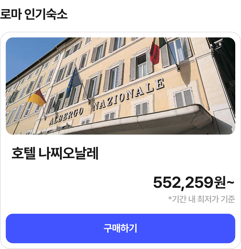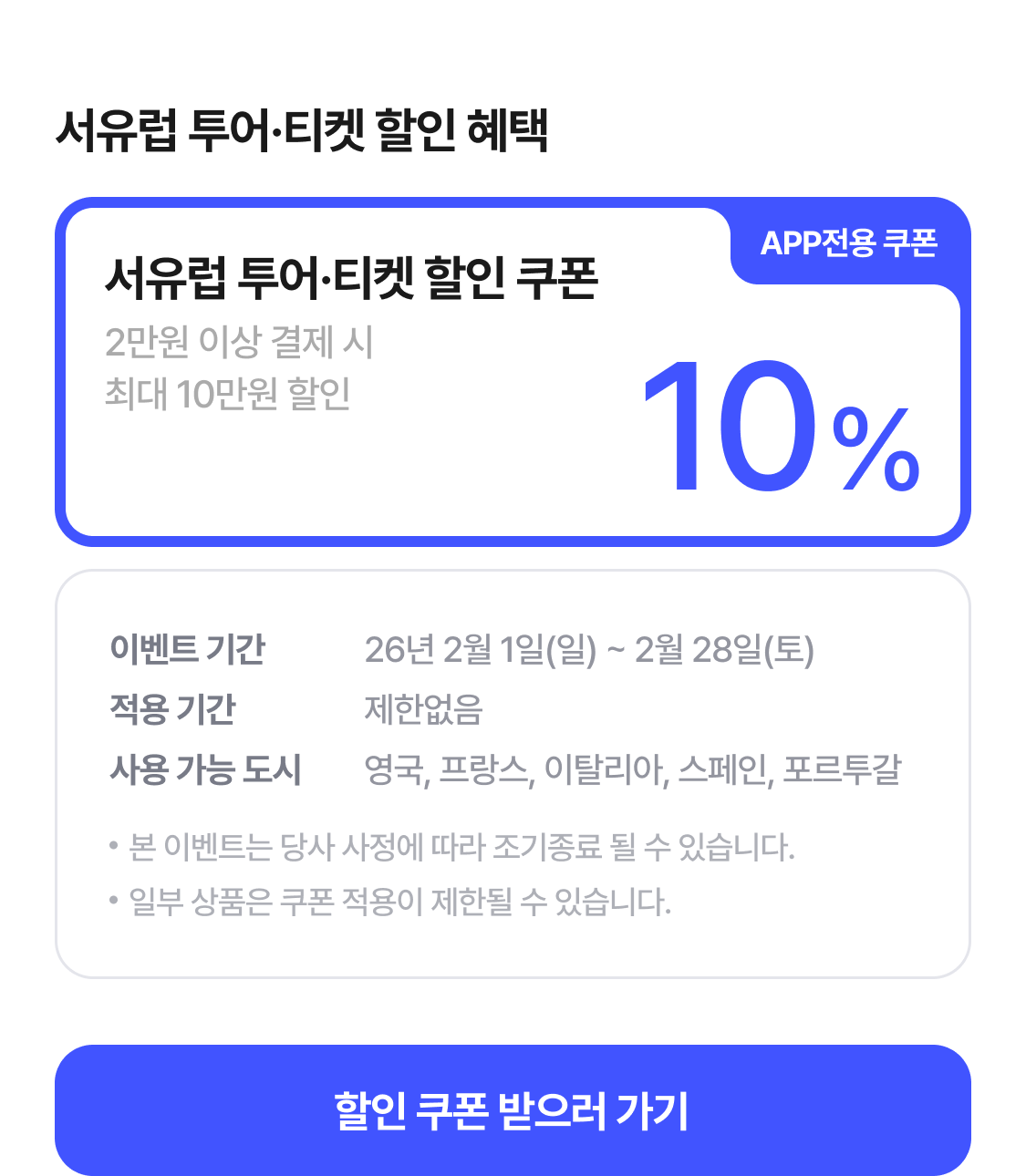 | 이달의 국가 서유럽숙소 할인쿠폰 (서유럽 숙소 전용) | 10% 할인(최대 50,000원) | ∘ 26년 3월 1일(일) ~ 12월 31일(목) 투숙 상품 대상∘ 2박 이상