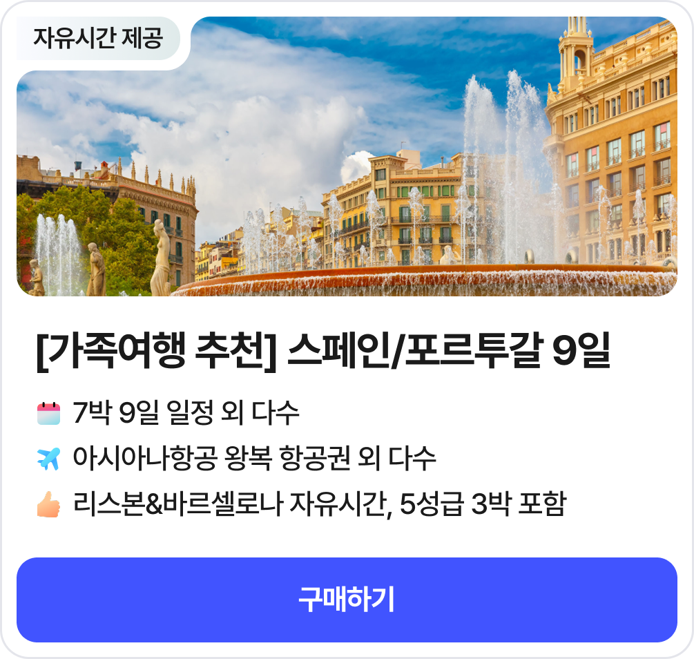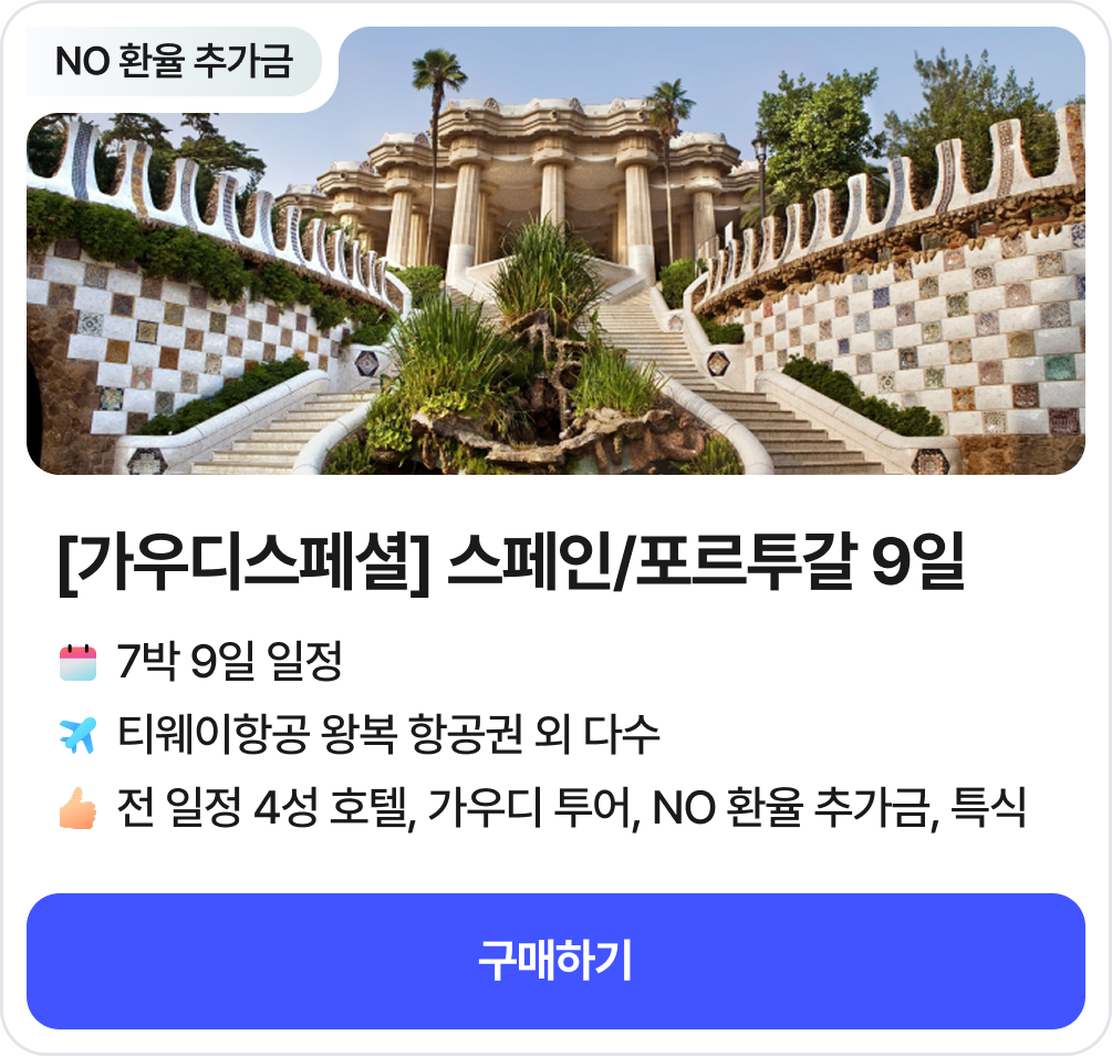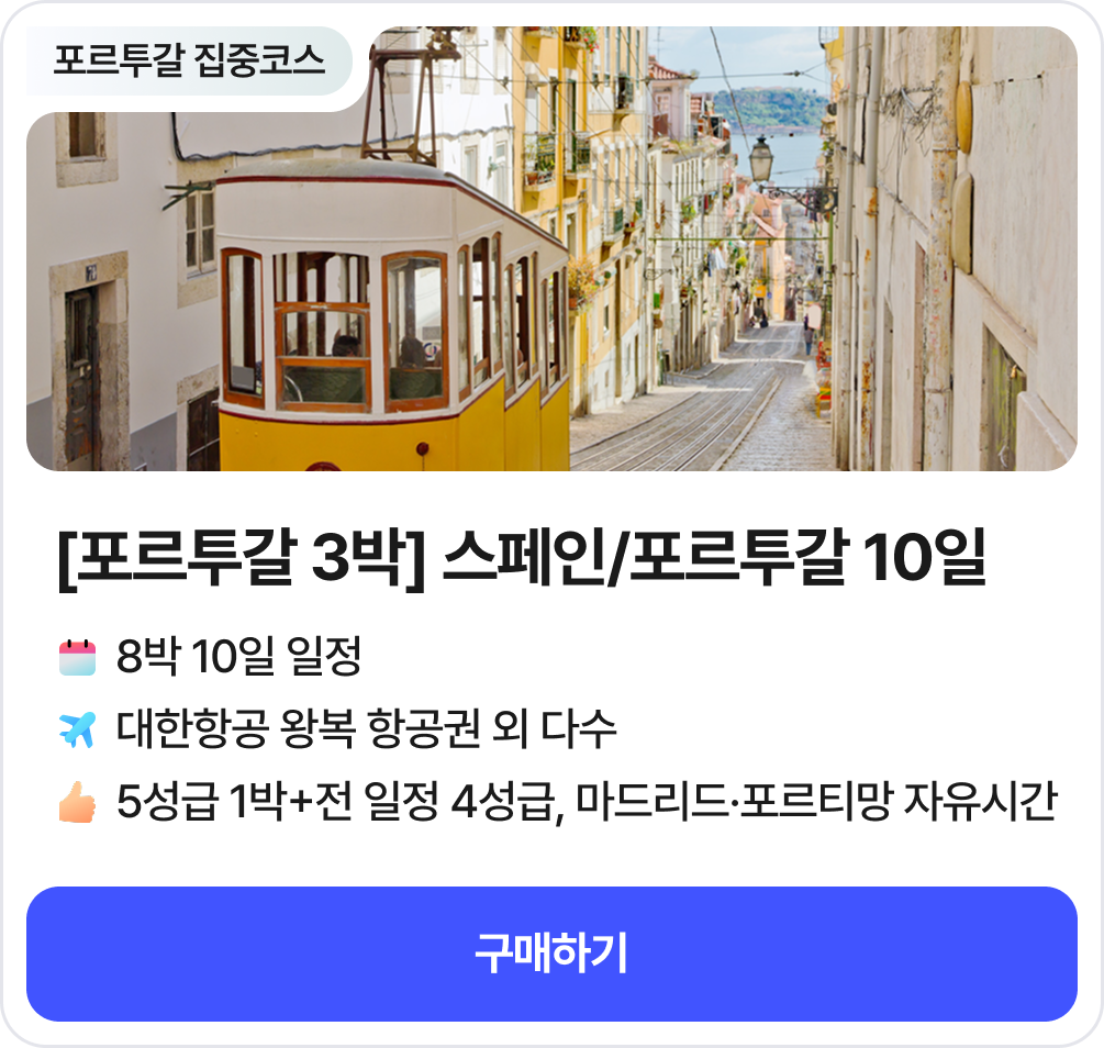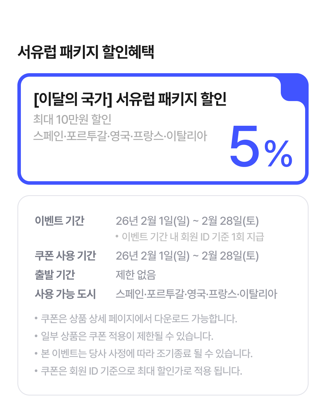 | [이달의 국가] 서유럽 패키지 5% 할인 | 5% 할인(최대 10만원 할인) | ∘ 최소 1만원 이상 결제 시∘ 사용 가능 지역 스페인·포르투갈·영국·프랑스·이탈리아 |