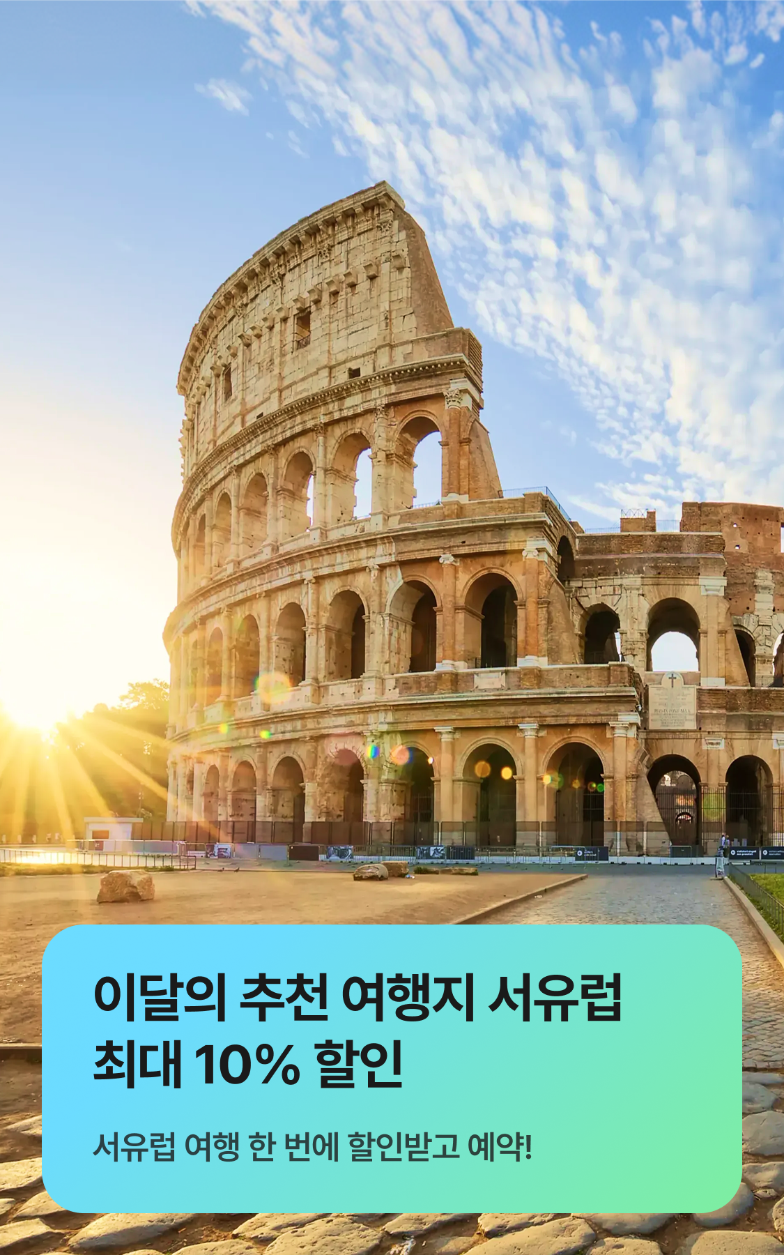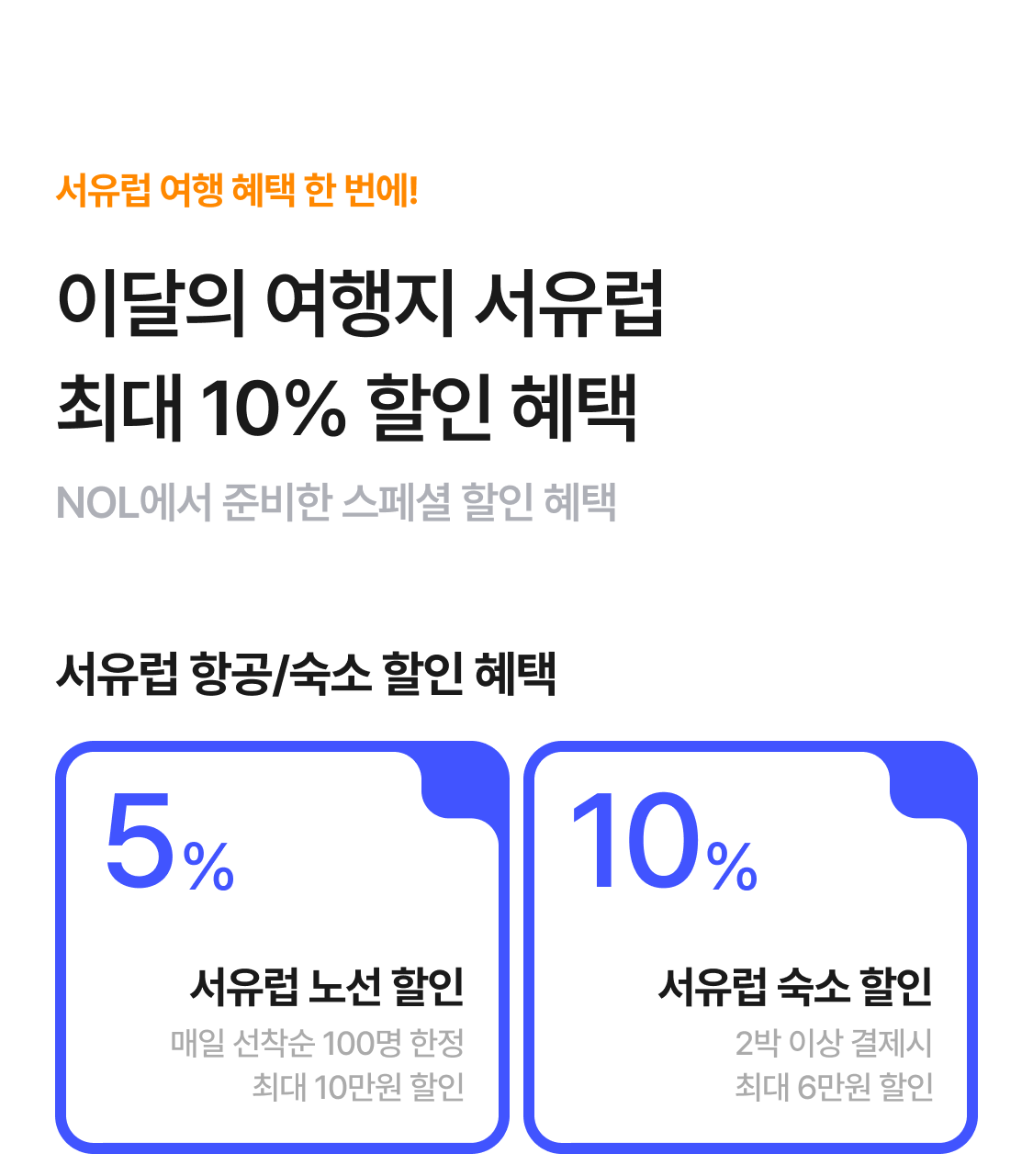 | [이달의 여행지] 서유럽 5개국 국제선 5% 선착순 할인쿠폰 | 5% 할인(최대 10만원 할인) | ∘ 탑승기한 제한없음∘ 상품 판매가