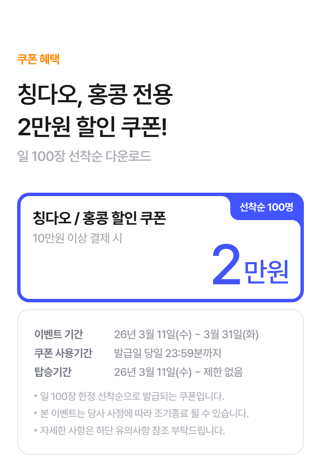 [반차쓰기 좋은 여행 홍콩/칭다오 선착순 2만원 쿠폰 국제선 할인쿠폰 유의사항]