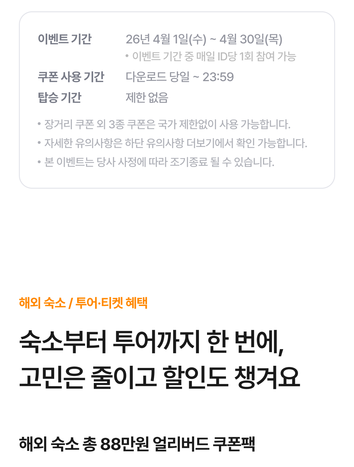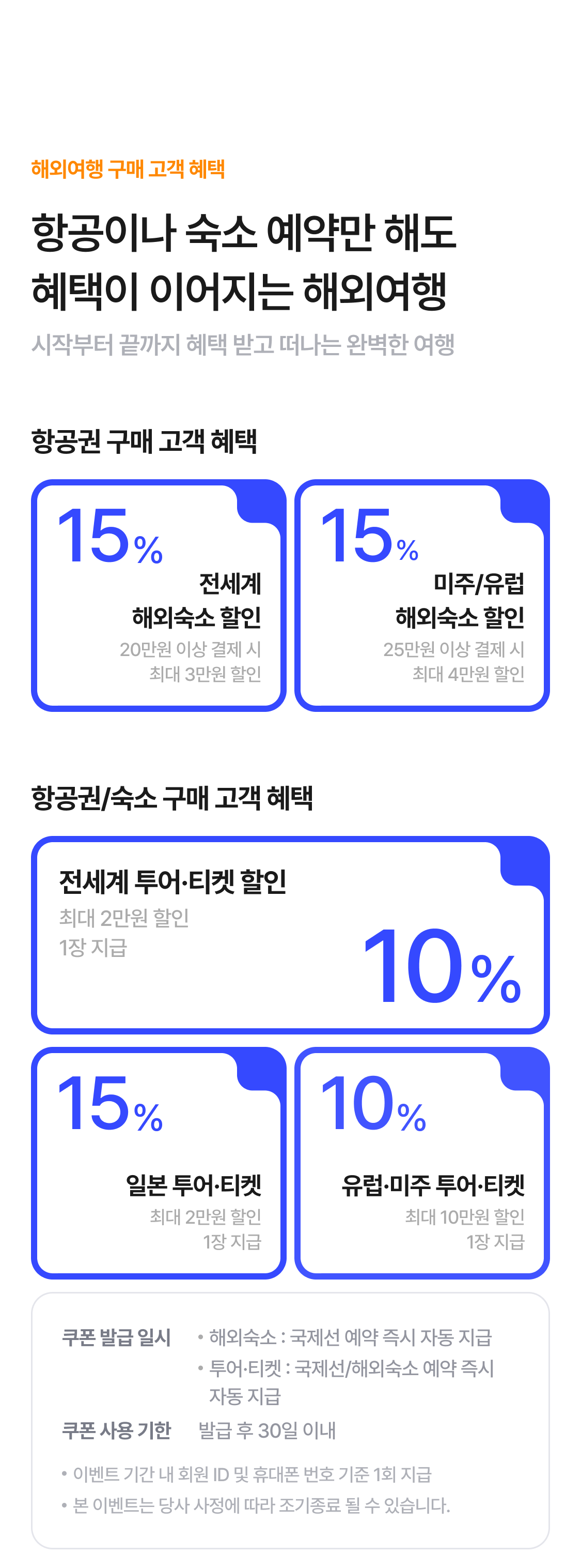 | 해외숙소 예약고객 | [해외숙소 예약 혜택] 해외투어·티켓 10% 할인쿠폰 | 10%할인(최대 2만원 할인) | 발급 후 30일간 사용가능 |