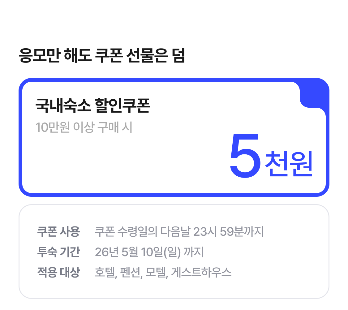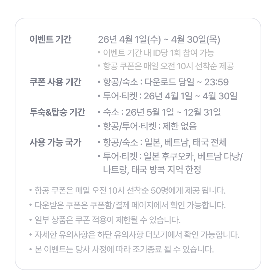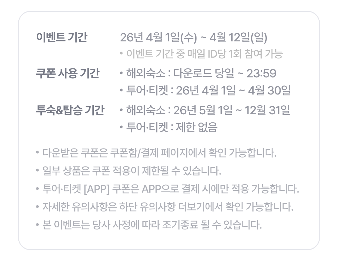 | 가정의 달 해외숙소 할인쿠폰 | 8% 할인(최대 40,000원) | ∘ 26년 5월 1일(금) ~ 12월 31일(목) 투숙 상품 대상∘ 2박 이상 결제시 적용∘ 발급일로부터 14일이내 사용가능∘ 적용 국가 : 일본, 베트남, 태국 |