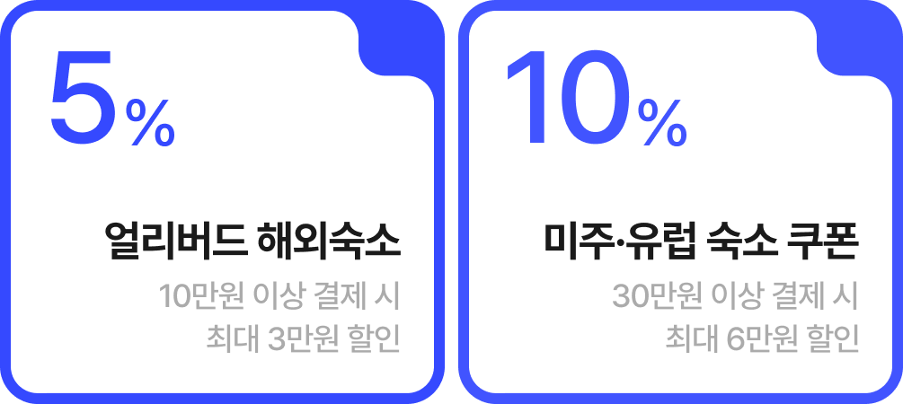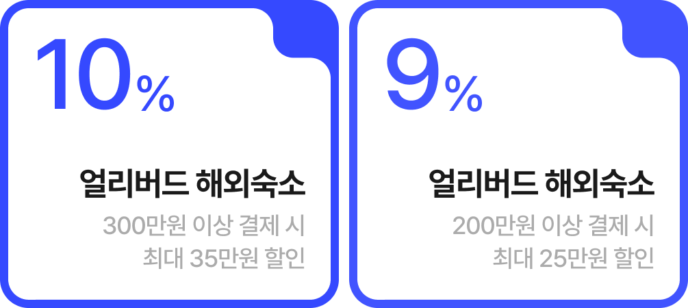 | 해외숙소 10% 할인쿠폰 | 10% 할인(최대 350,000원) | ∘ 상품 판매가 300만원 이상 결제시 적용∘ 발급 당일 23:59분까지 사용가능 |