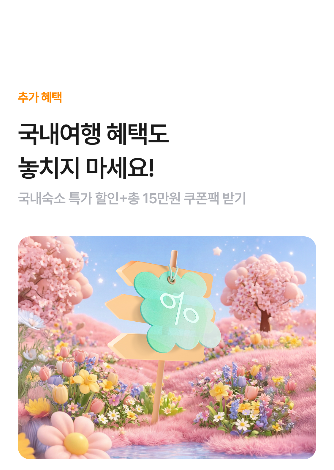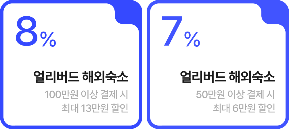 | 해외숙소 8% 할인쿠폰 | 8% 할인(최대 130,000원) | ∘ 상품 판매가 100만원 이상 결제시 적용∘ 발급 당일 23:59분까지 사용가능 |