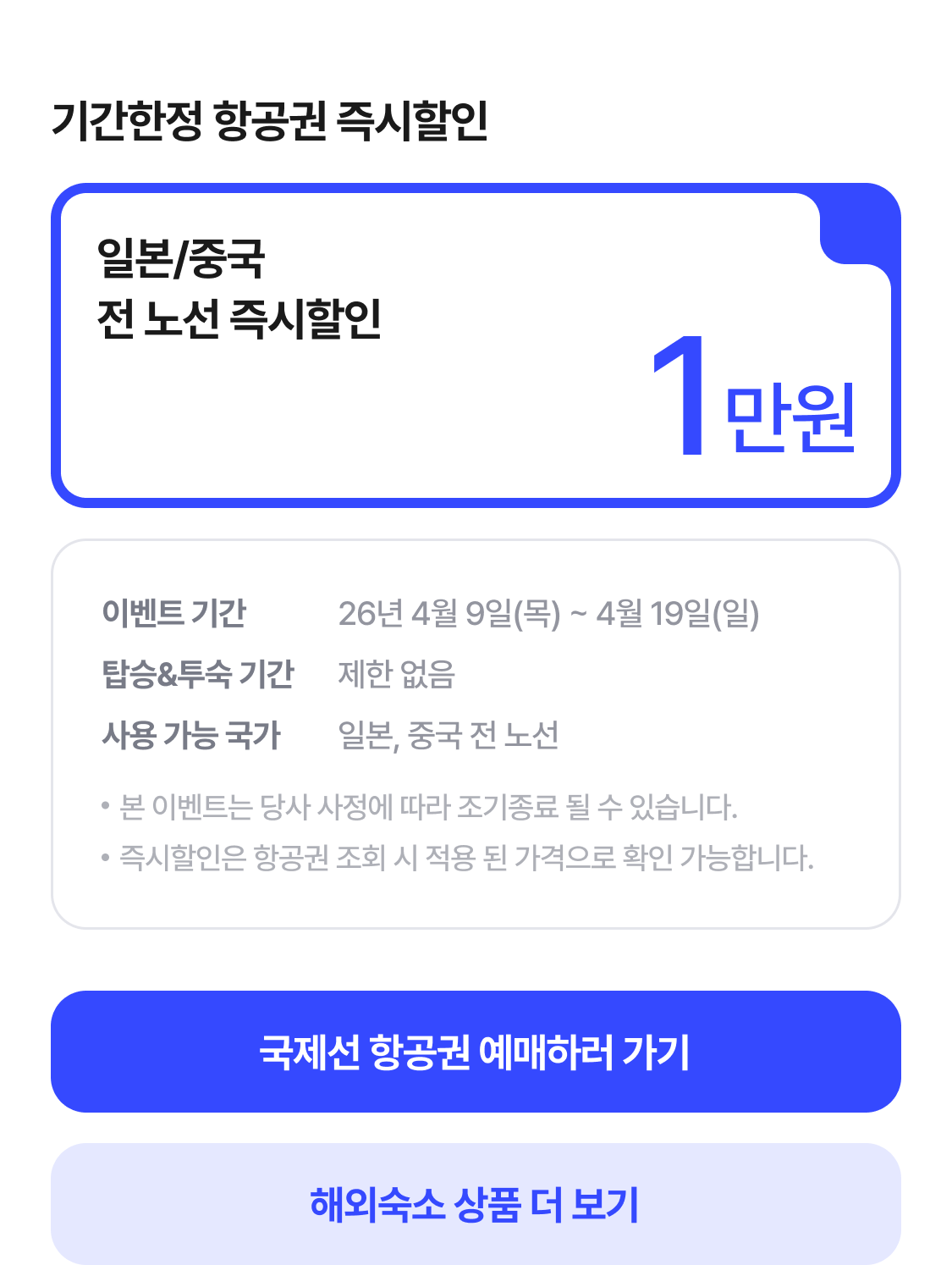 | 항공-국제선 즉시할인 | 1만원 즉시할인 | 대상국가 : 일본/중국 |