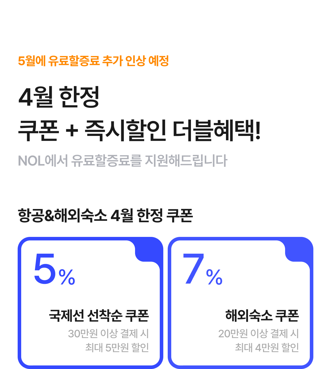 | [가정의 달]국제선 인기지역 5% 선착순 할인 쿠폰 | 5% 할인(최대 5만원 할인) | ∘ 탑승기한 : 제한없음∘ 상품 판매가 30만원 이상 결제시 적용∘ 매일 오전 10시, 선착순 100명 발급∘ 발급 당일 23:59분까지 사용가능∘ 적용 국가 : 일본, 중국, 베트남, 태국 전 노 |