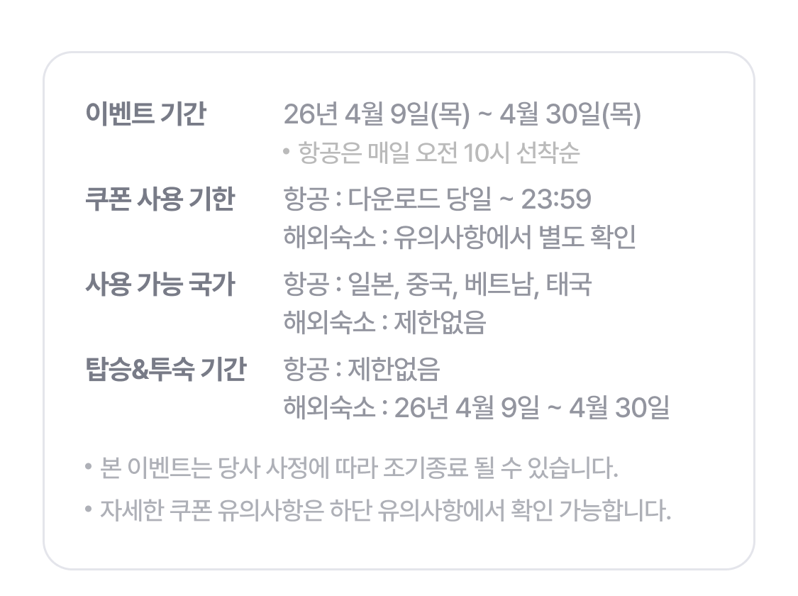 | [반짝쿠폰] 해외숙소 7% 할인쿠폰(4월 투숙 전용) | 7% 할인(최대 40,000원) | ∘ 상품 판매가 20만원 이상 결제시 적용∘ 2026년 4월 8일 (수) - 4월 19일(일) 내 사용가능∘ 26년 4월 투숙상품에만 적용가능 |