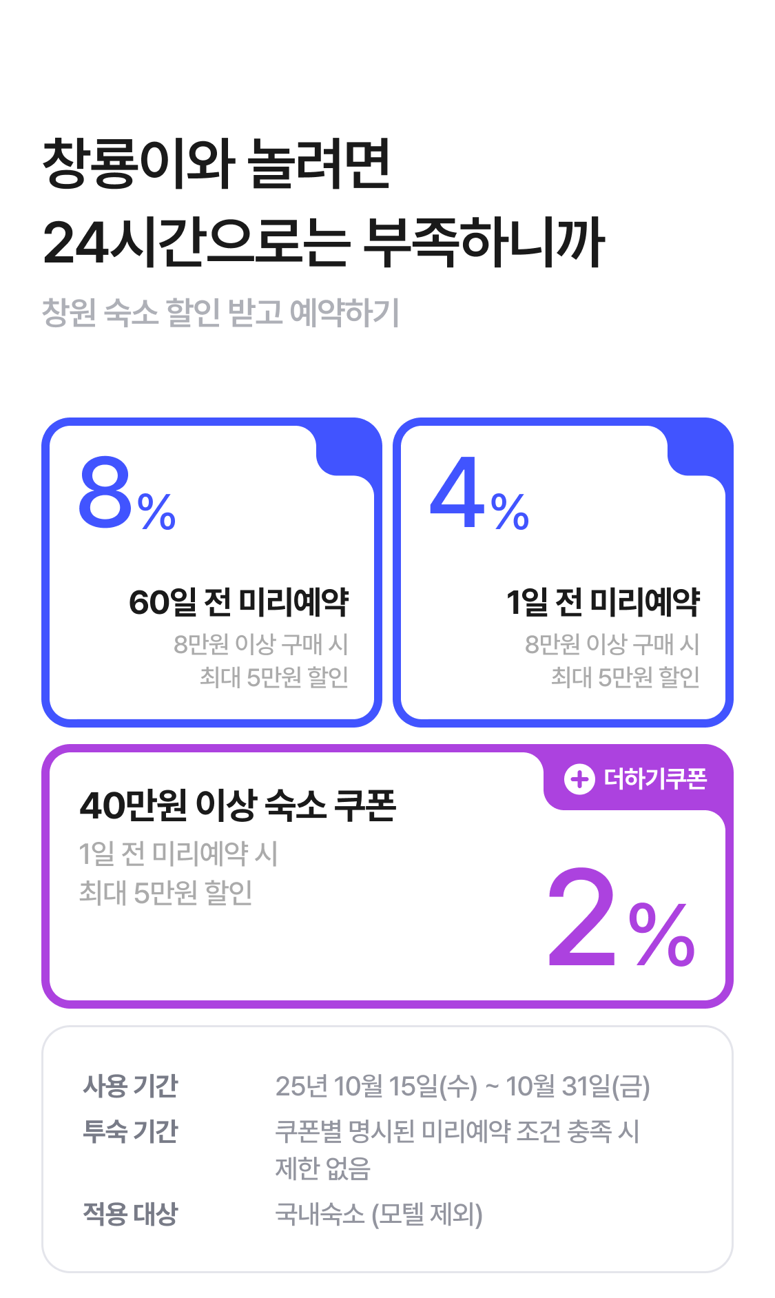 투숙 가능 기간 : 각 쿠폰별 표시된 체크인 최소 60일 전, 1일 전 미리예약 시 제한 없음