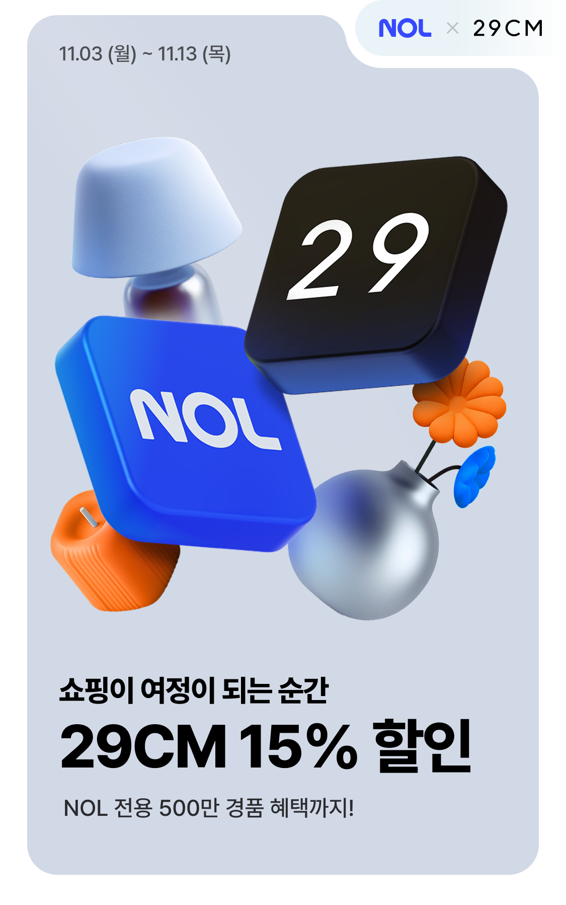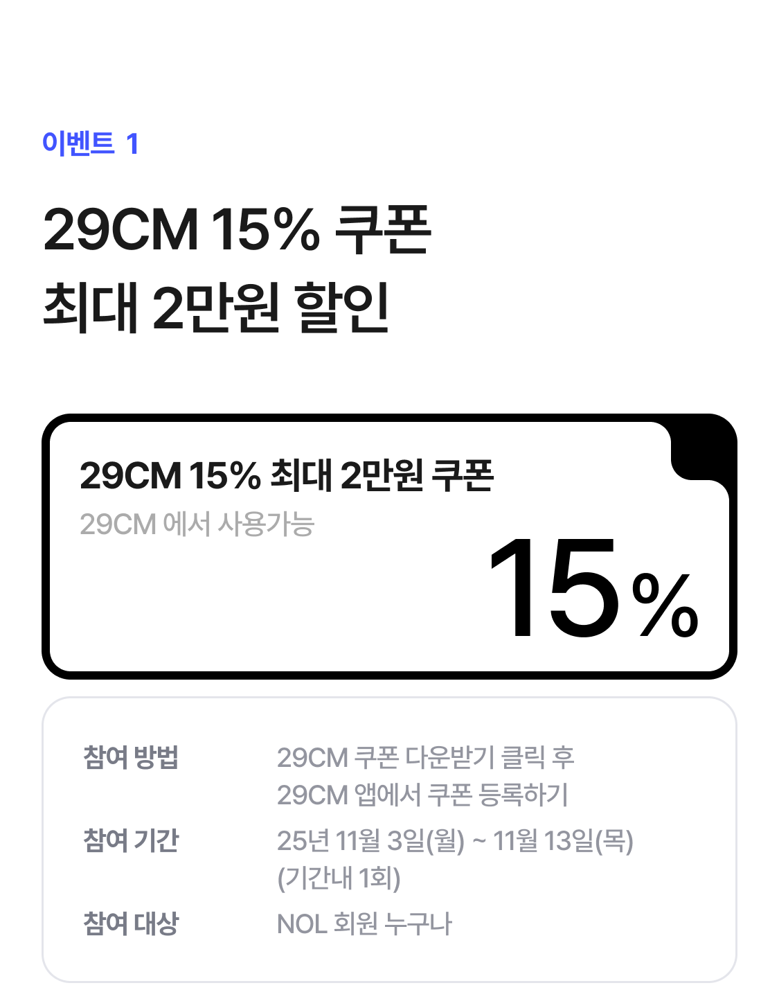 [29CM 제휴 혜택 유의사항] - 최소 주문 금액 : 없음 - 최대 할인 금액 : 20,000원 - 발급받은 쿠폰을 사용하시려면 29CM 계정이 필요합니다. - 29CM 웹/앱에서 쿠폰 등록이 가능합니다. - 쿠폰 등록 경로(앱: 29CM 앱 실행 > 마이페이지 > 쿠폰 > 쿠폰등록, 웹: MY PAGE > 쿠폰 > 쿠폰등록) - 본 쿠폰은 계정당 1개만 등록 가능합니다. - 쿠폰 등록 기간: 2025.11.03(월) - 2025.11.13(목)까지 - 쿠폰 사용 기간은 쿠폰 등록일로부터 14일간 유효하며, 기간 경과 시 자동 소멸됩니다. - 본 쿠폰은 NOL과 29CM의 제휴 혜택으로 제공되며, 쿠폰의 유효기간 연장 또는 환불 대상이 아닙니다. - 본 쿠폰은 등록하는 즉시 해당 계정으로 발급되며, 다른 계정으로 변경 지급은 불가합니다. - 일부 브랜드 또는 카테고리 상품은 쿠폰 적용이 제한될 수 있습니다. - 다른 할인 쿠폰, 프로모션, 적립금과 중복 적용이 불가할 수 있습니다.