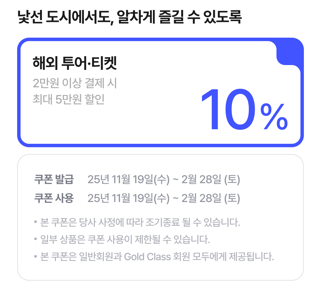 | 제공 혜택 | 해외 투어·티켓 10% 할인쿠폰- 2만원 이상 최대 5만원 할인