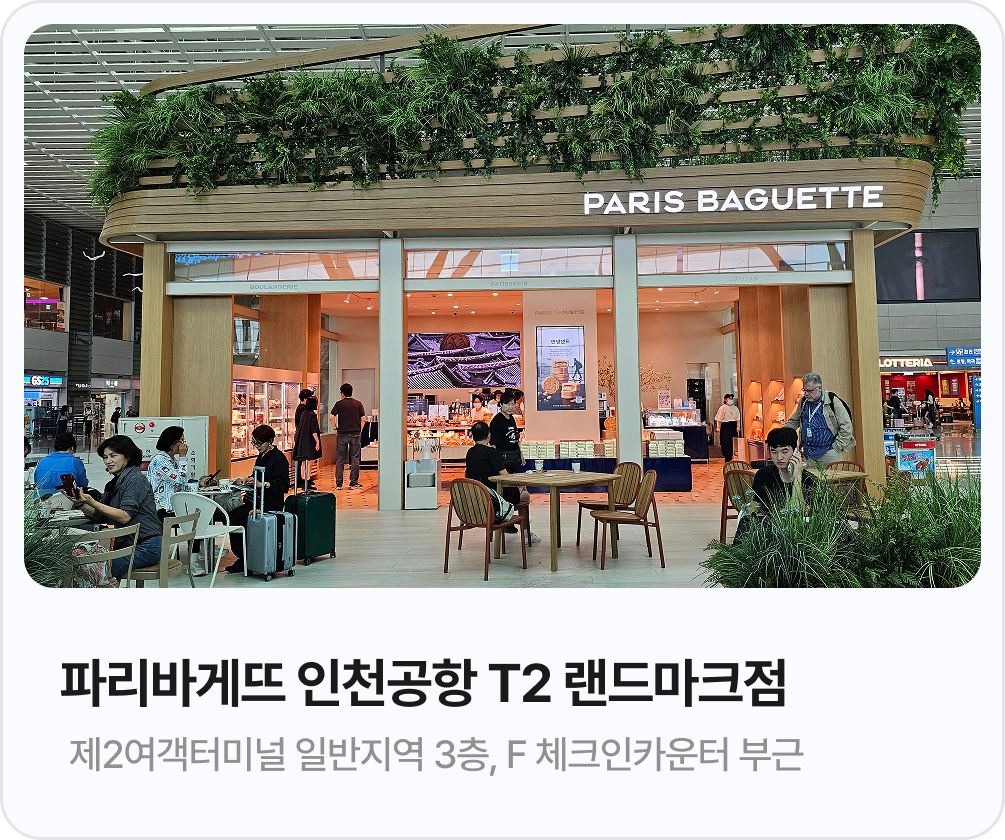 1) 파리바게뜨 인천공항 T1 에어이스트점 - 상세주소: 인천국제공항 제1여객터미널 면세구역 동편 탑승구 12번 부근2) 파리바게뜨 인천공항 T1 에어랩점 - 상세주소: 인천국제공항 제1여객터미널 일반지역 3층, G 체크인카운터 부근3) 파리바게뜨 인천공항 T2 랜드마크점 - 상세주소: 인천국제공항 제2여객터미널 일반지역 3층, F 체크인카운터 부근 |