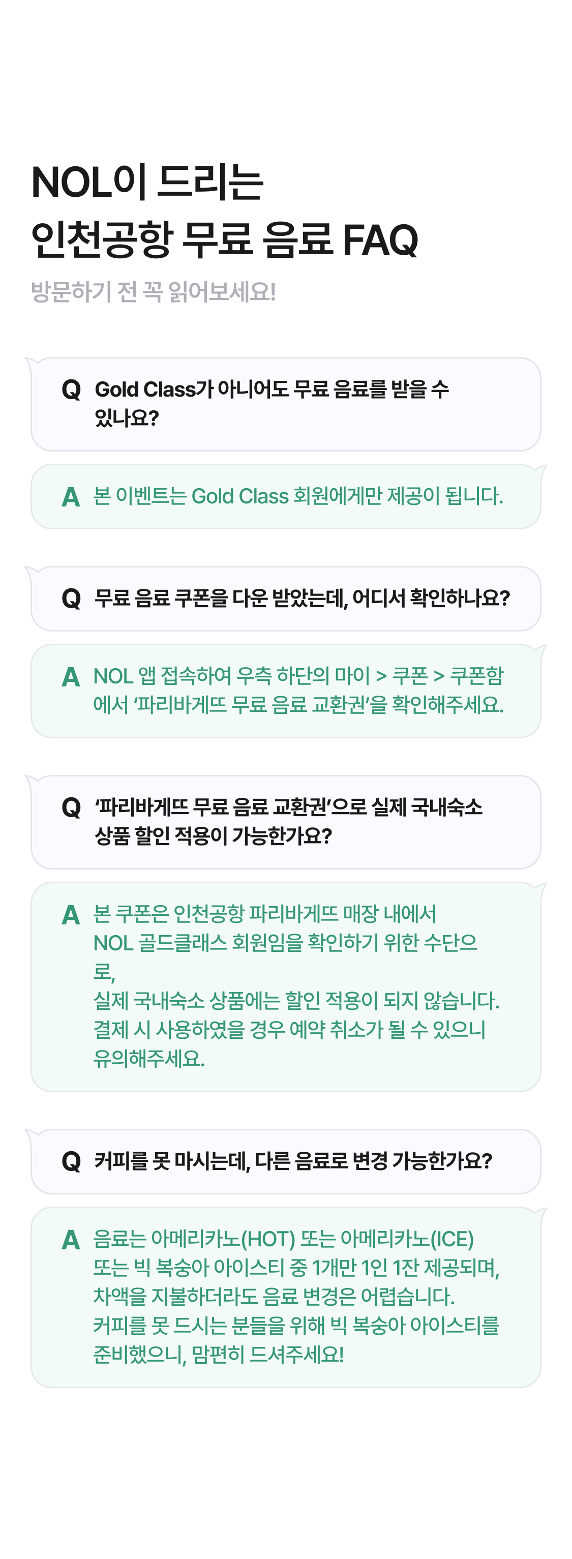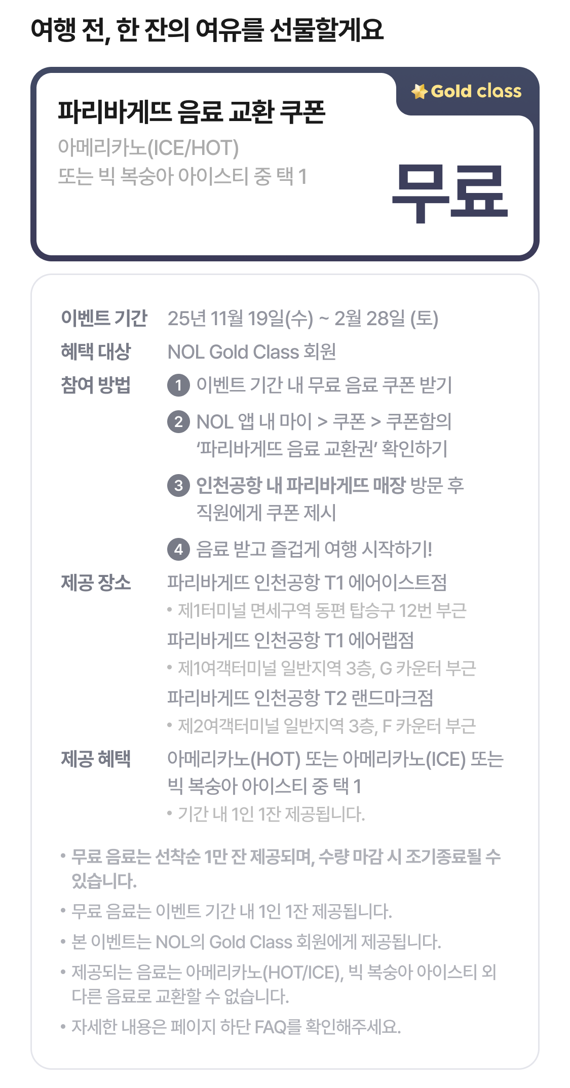 | 혜택 제공 시점 | 무료 음료 교환권 발급 후 인천공항 매장 방문하여 쿠폰 제시 시 제공 |