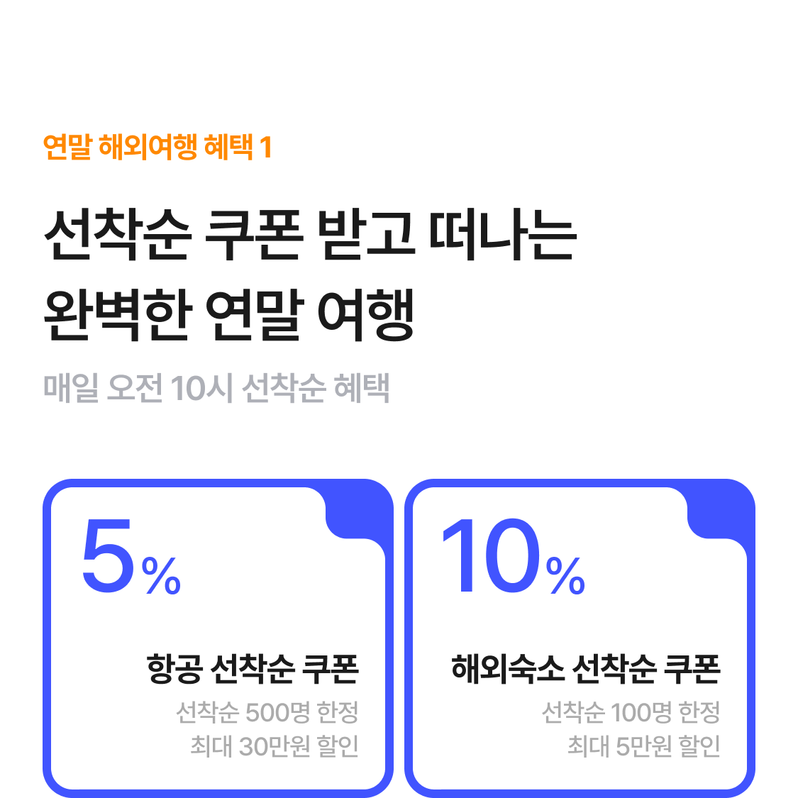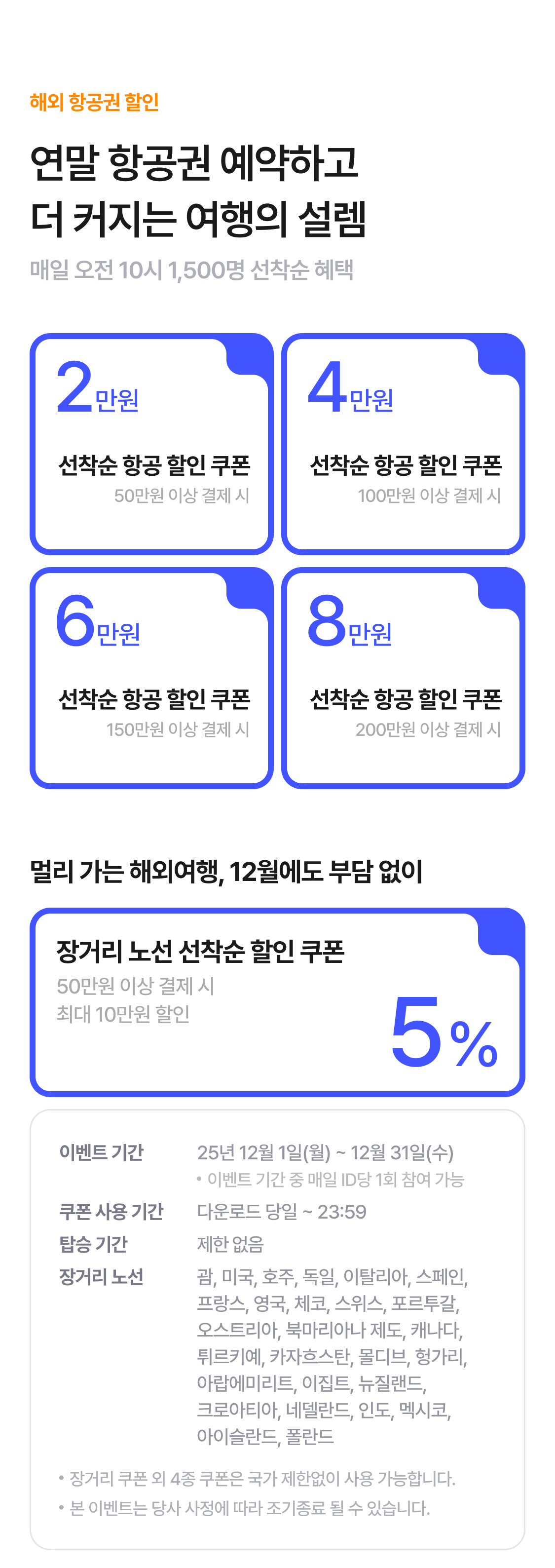| 항공 선착순 장거리 5% 할인쿠폰 | 최대 10만원 할인 |
