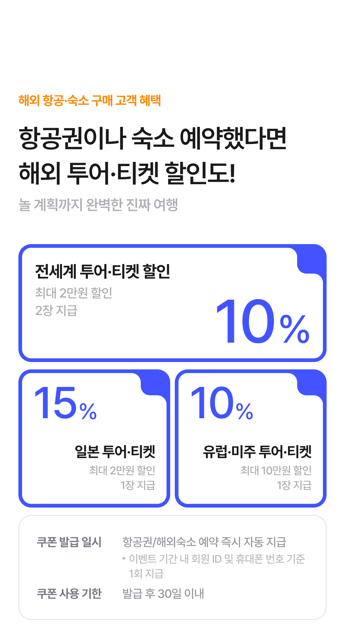 | 국제선 예약고객 | [항공 예약 혜택] 해외투어·티켓 10% 할인쿠폰 | 10%할인(최대 2만원 할인) | 발급 후 30일간 사용가능 |